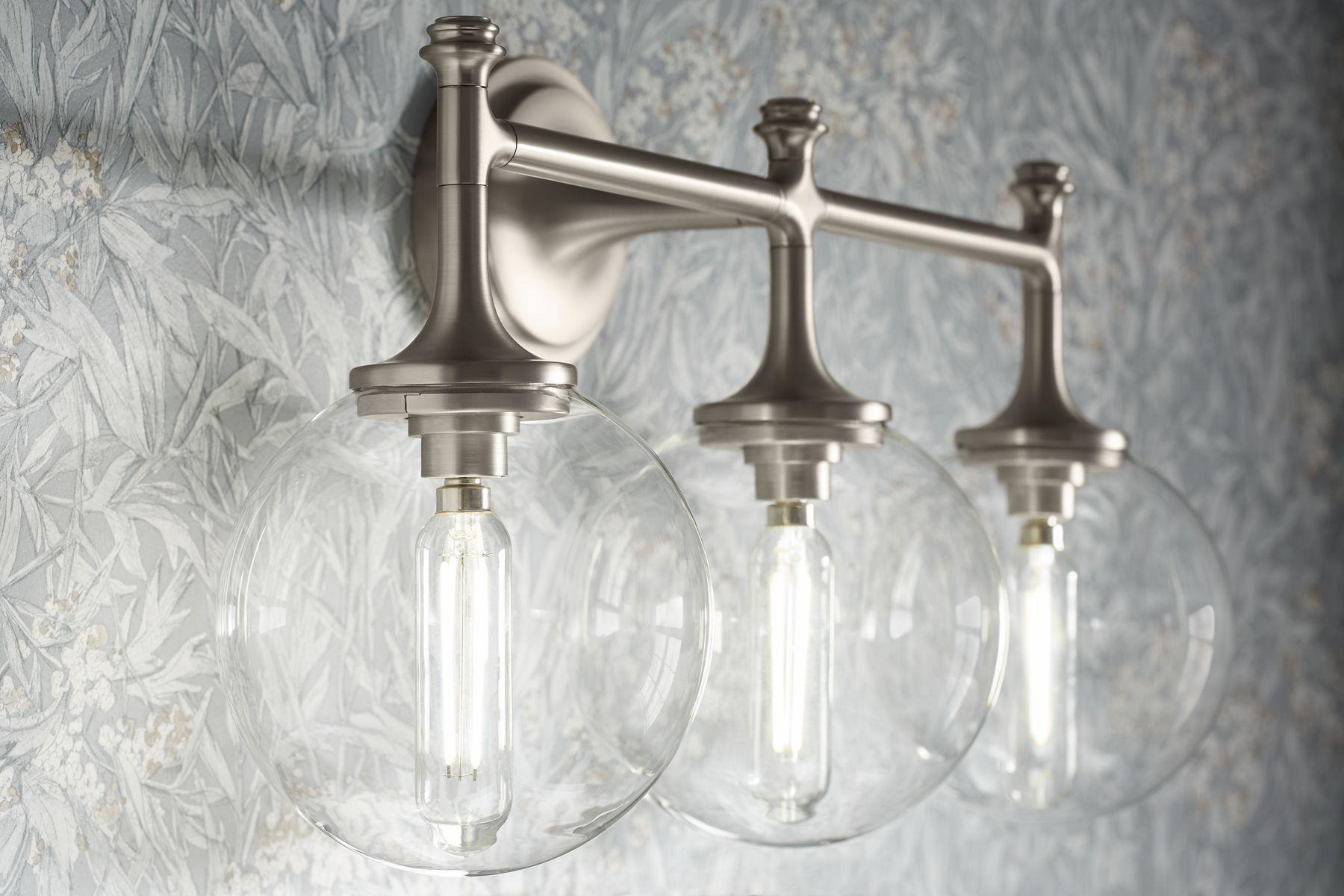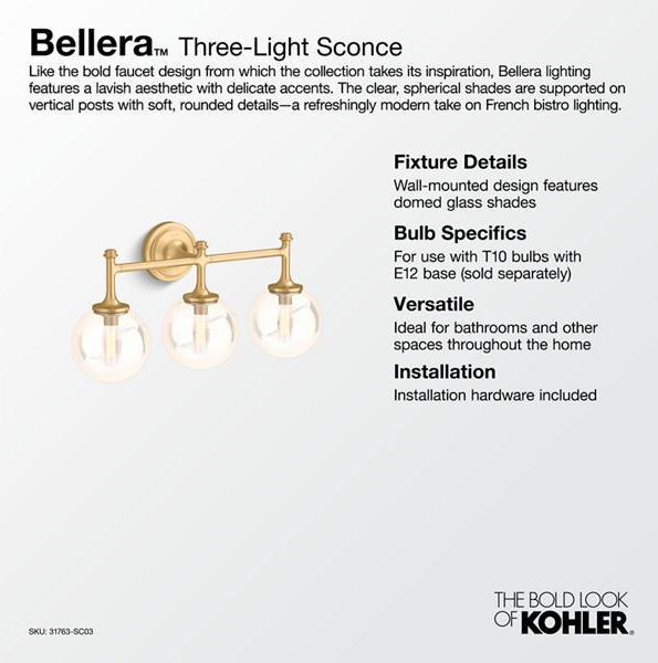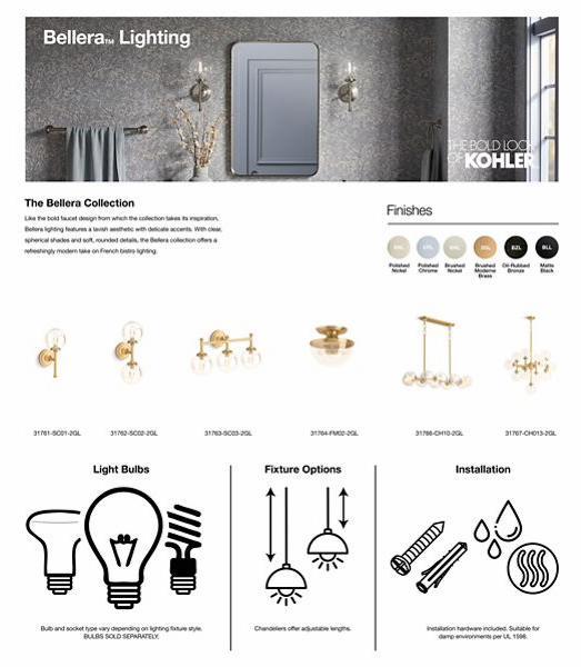 Distinguished by elegant, jewelry-inspired silhouettes, the Bellera lighting collection adds style and grace to the home with sconces, pendants, chandeliers, and flush-mounts. Featuring clear glass globes, flared metal rods and bases, and intricate metal detailing, Bellera fixtures deliver versatility with a transitional style that easily flows with your entire home's aesthetic. Brilliant and functional, these pieces were created to complement the KOHLER® Bellera faucet collection.