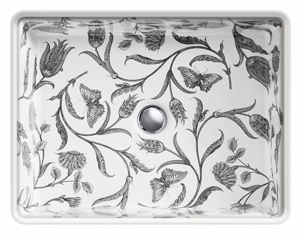 Inspired by a 16th-century Turkish design, Botanical Study features intricate line work of tulips and chrysanthemums winding together. The floral pattern paired with the rectangular Kathryn sink creates a casual, traditional feel. In a neutral palette that blends beautifully with natural materials and muted tones, this under-mount sink adds an alluring touch to your bath or powder room.