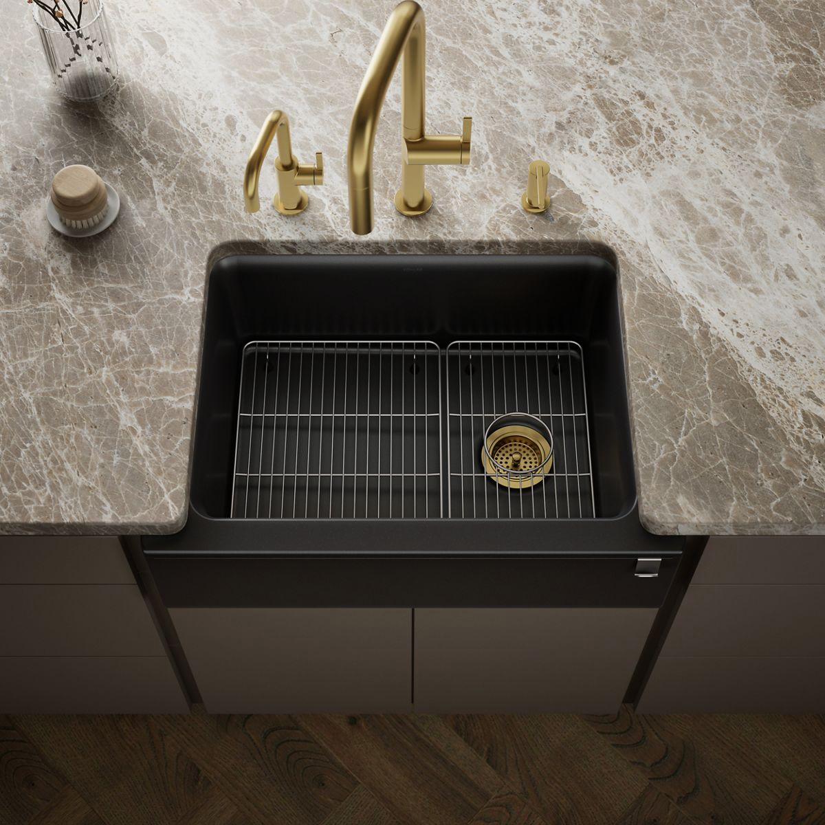 With soft French curves, the Cairn kitchen sink offers transitional style to suit contemporary and traditional kitchens alike. Cairn is made of KOHLER Neoroc, a matte-finish composite material designed for extreme durability and unmatched beauty. Richly colored to complement any countertop, Neoroc resists scratches, stains, and fading, and is highly heat- and impact-resistant. The Self-Trimming apron design requires only a simple rough cut, overlapping the cabinet face for beautiful results.
