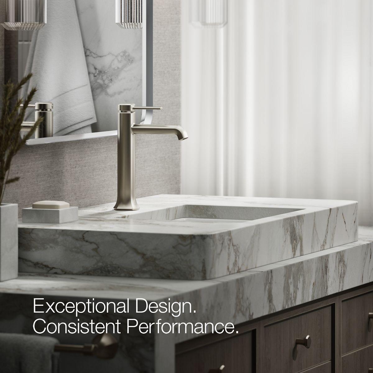Unapologetically luxurious and truly unforgettable, Occasion bathroom faucets and accessories draw inspiration from 1960s Hollywood glamour and extravagance. Fashioned after the era’s sleek dress lines and bold car designs, the Occasion collection reflects graceful elegance, blending classic midcentury and modern design. Customize your bath with the collection’s distinctive pentagonal accents, faceted bases, flowing lines, and delicate edges. The tall single-handle sink faucet adds sleek style and function to your bathroom—in finishes designed to coordinate with the entire room.