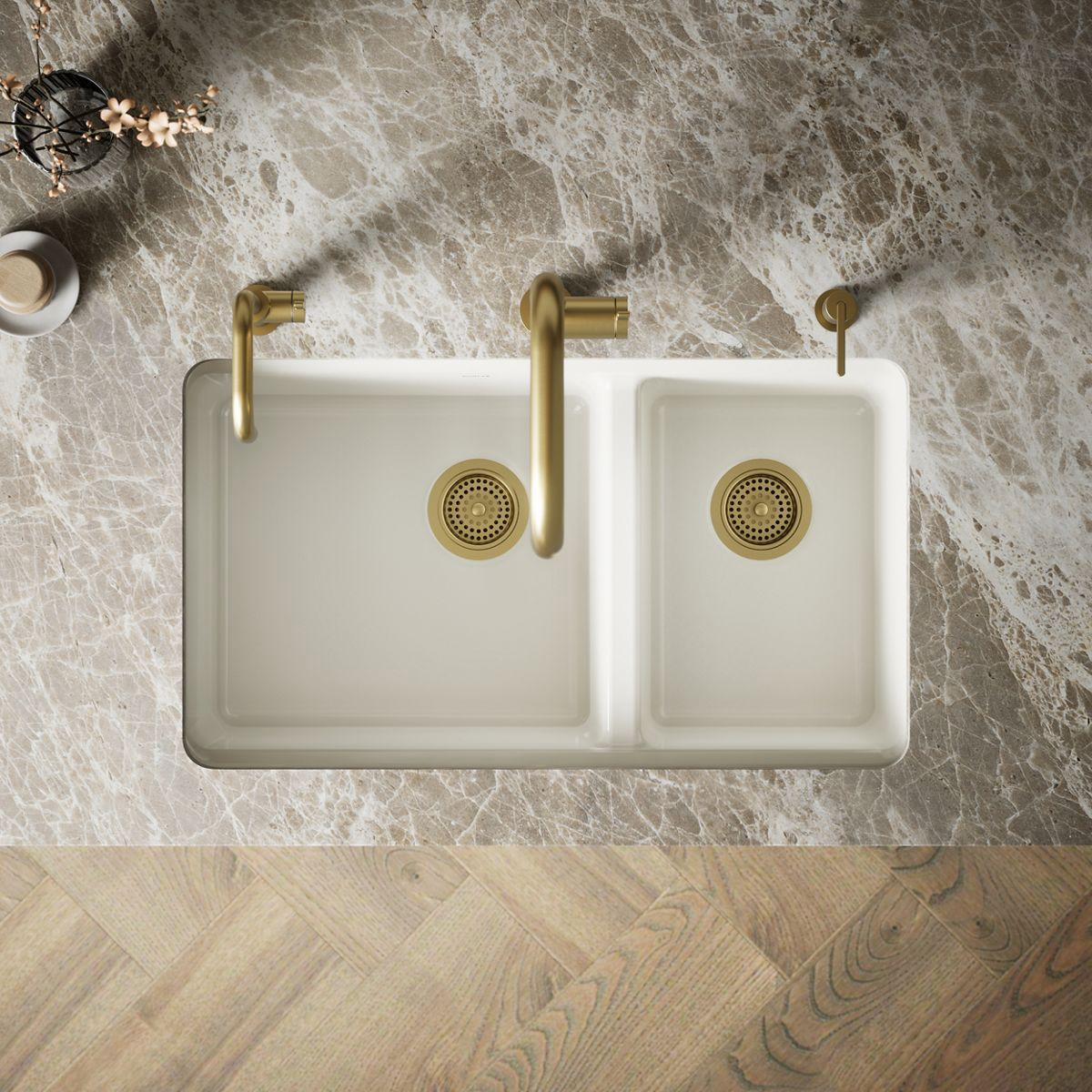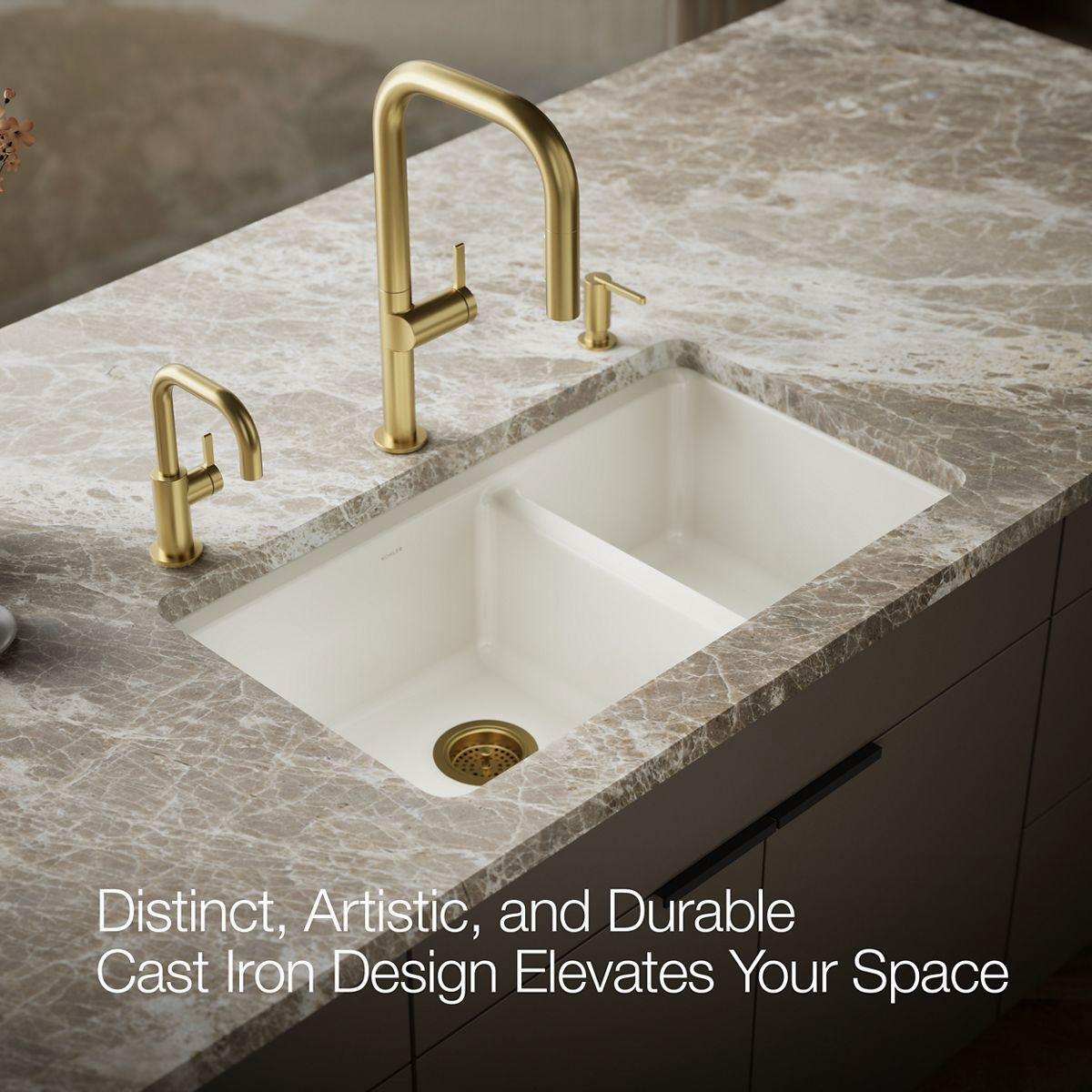The understated beauty of this Riverby sink makes it an elegant and versatile addition to the kitchen. The large/medium bowls allow you to keep clean and dirty dishes separate, while a sloped base minimizes water pooling. Crafted from enameled cast iron, this sink resists chipping, cracking, or burning for years of beauty and reliable performance. It comes with a custom-fit colander with integral cutting board, a utility rack with soaking cup, and a stainless-steel bottom sink rack.
