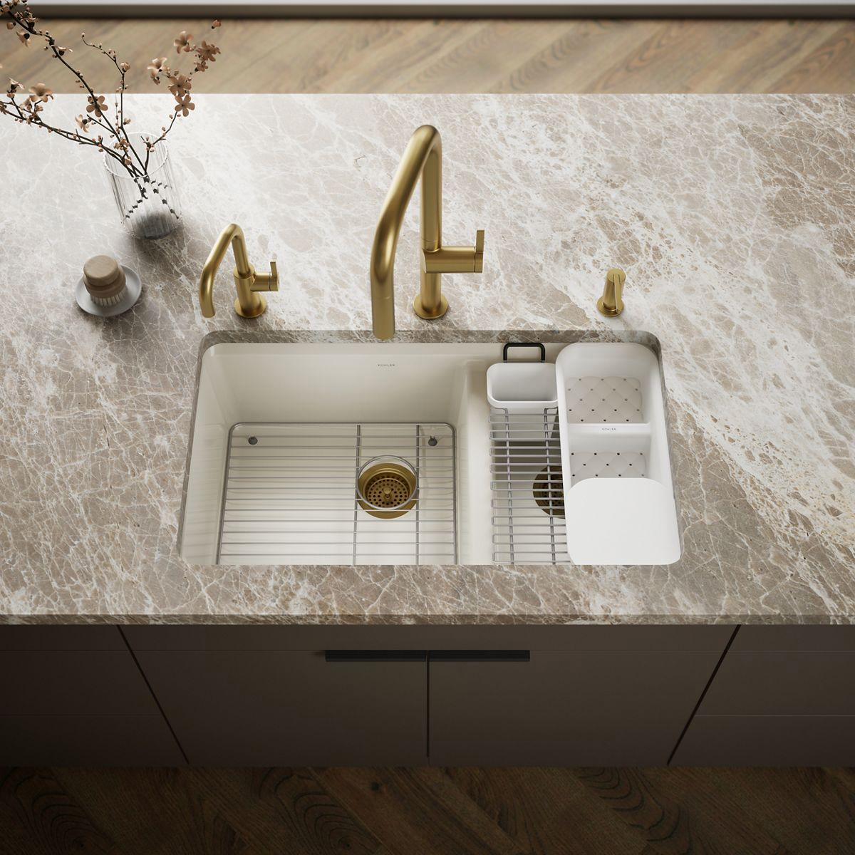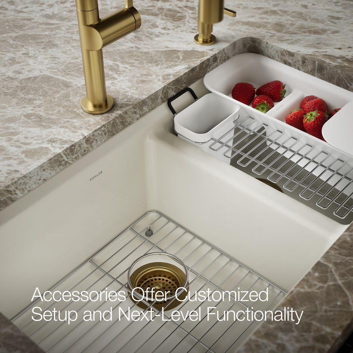 - Includes K-6239 colander with integral cutting board, K-6194 utility rack with soaking cup, and K-9234 left-hand bottom sink rack.
