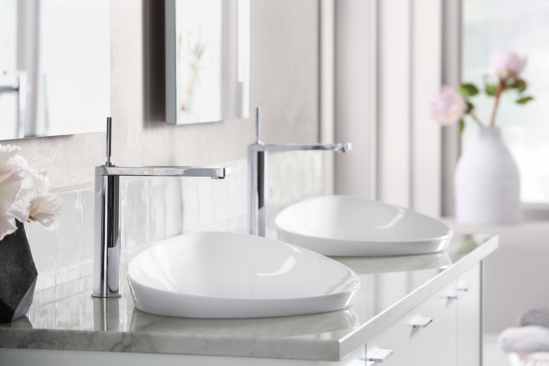The Veil vessel-mounted bathroom sink features flowing and immaculately balanced curves that evoke a sculpted simplicity in tune with contemporary style. Enhanced by a high-gloss finish, the basin's sleek, organic shape is easy to clean. At Kohler, we make it our business to help you create the bathroom space of your dreams.