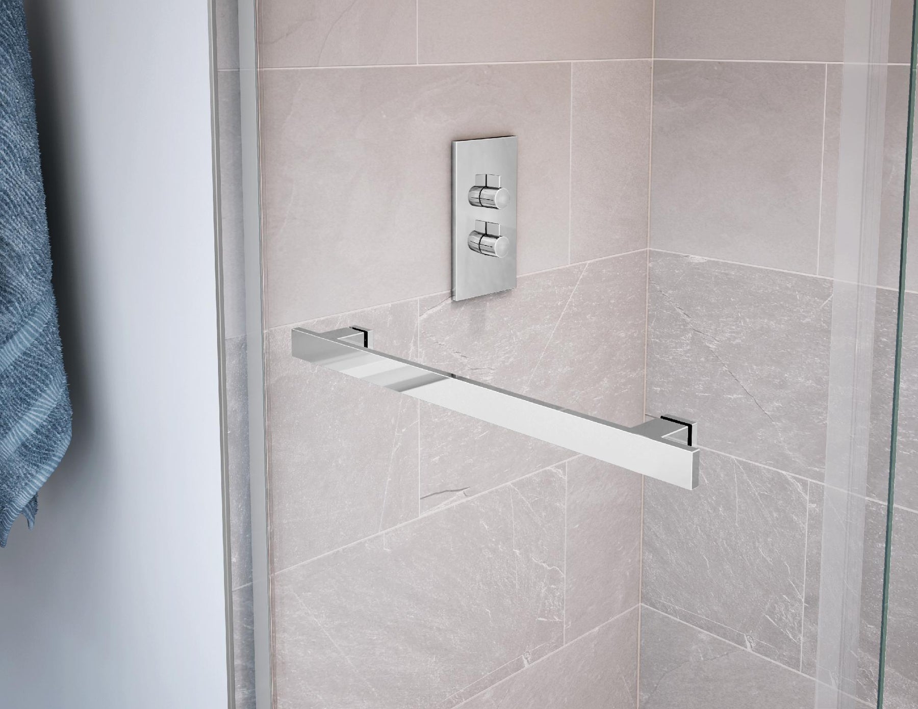 The Duel door lends a modern look to any bathroom with its square hardware accents and gorgeous chrome, dark bronze or brushed nickel frame finish.