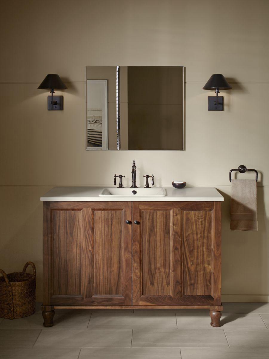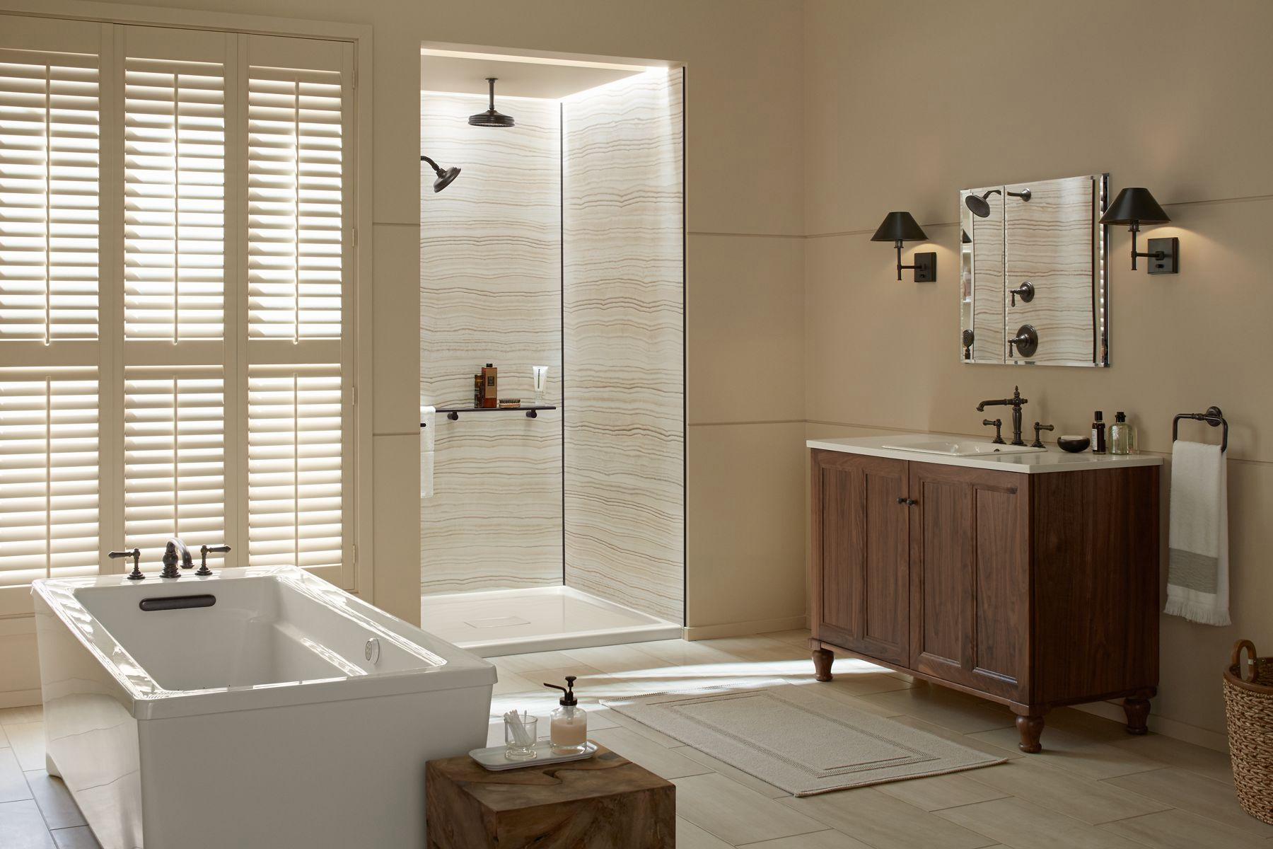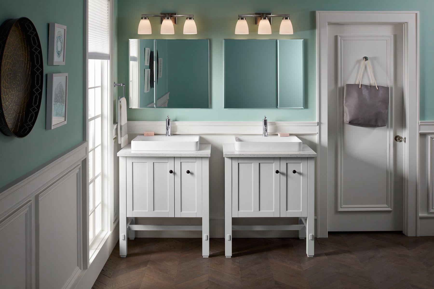 - Two adjustable tempered-glass shelves offer additional bathroom storage.