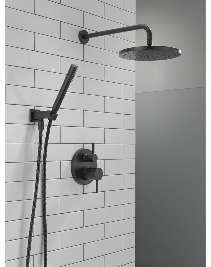 - Includes complete shower trim with raincan shower head and wall mount hand shower