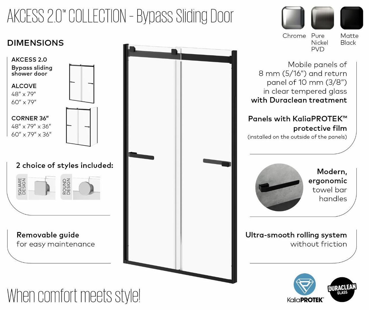 - Mobile panels in clear tempered glass of 8 mm (5/16”) with KaliaPROTEKTM protective film (the protective film is installed on the outside of the panels