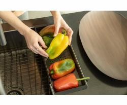 6.19-in. x 16.8-in. Colander for Mythos Masterpiece Series sinks, Anthracite. This colander sits directly over the Mythos Masterpiece sink, making it perfect to perform prep tasks more efficiently and for rinsing, draining vegetables, fruits or pasta.