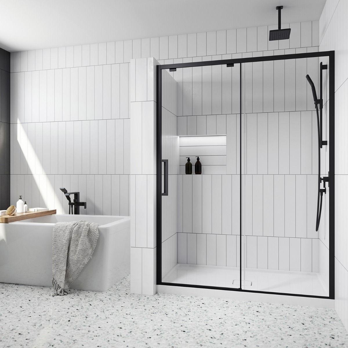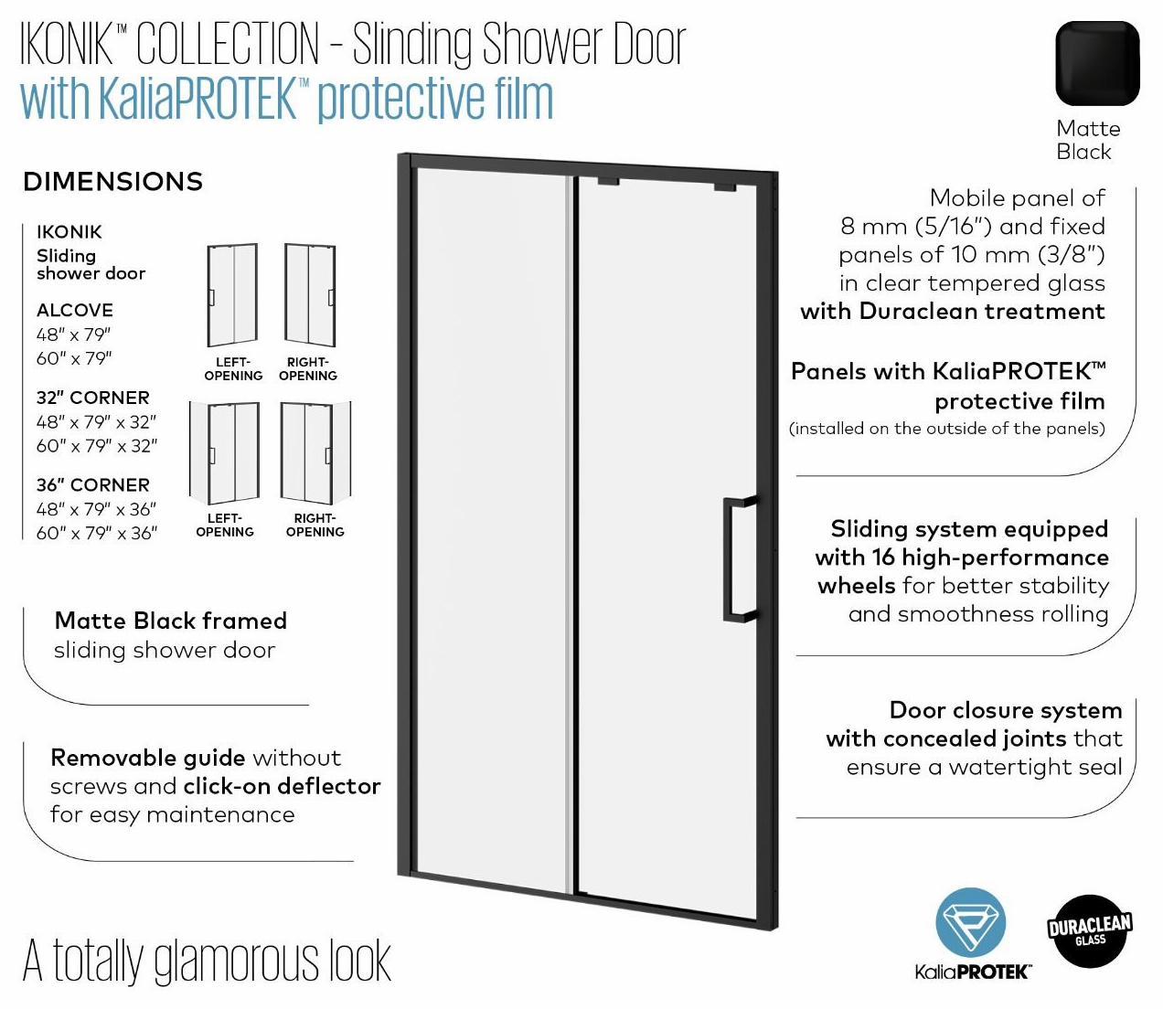 48” x 79” sliding shower door with clear glass with KaliaProtek protective film - Matte Black - Left opening