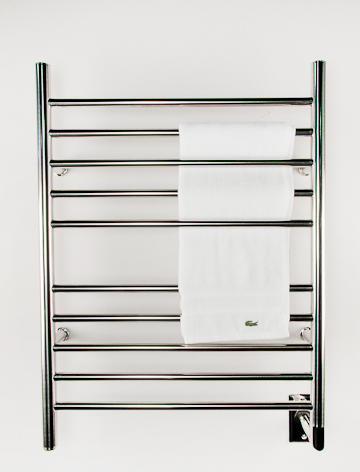The timeless design of this polished towel warmer with 10 straight, horizontal bars in a 5-5 configuration, is a beautiful look in any setting. Perfectly sized to accommodate 2 towels, it warms them up and dries them out while helping to reduce humidity in the bathroom. The integrated on/off switch and included hardwired kit means everything is included right out of the box. Unit dimensions are 24"W x 32"H. An optional programmable timer can be added for additional functionality.