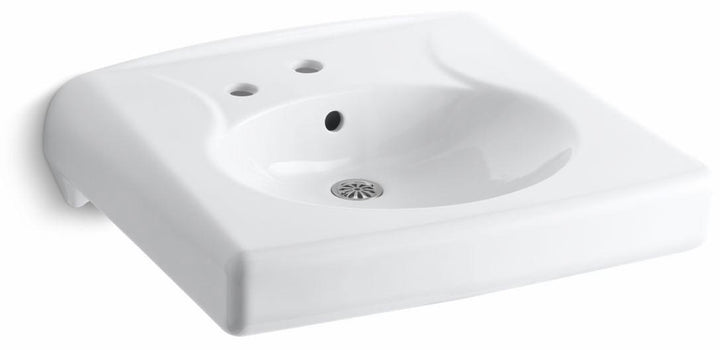This Brenham wall-mount sink combines the function and durability required for commercial spaces with a fresh, natural style. Its oval basin provides an elegant solution for barrier-free bathroom installations and can be combined with a matching shroud. A hole to the left of the faucet accommodates a soap or lotion dispenser.