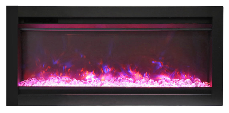 The SYMMETRY series offers a choice of two flame patterns, Amantii’s traditional diffused flame appearance and a new realistic flam style. The SYMMETRY features the multicolor FIRE & ICE® flame presentation and boasts a true clean face display unencumbered by unsightly heat vents. Ambient canopy lighting illuminates decorative media adding another element of dimension. The slim design allows for versatile applications including semi-flush mount within 2 x 4 wall and the standardized sizing allows for hassle free installation at any stage of your project.