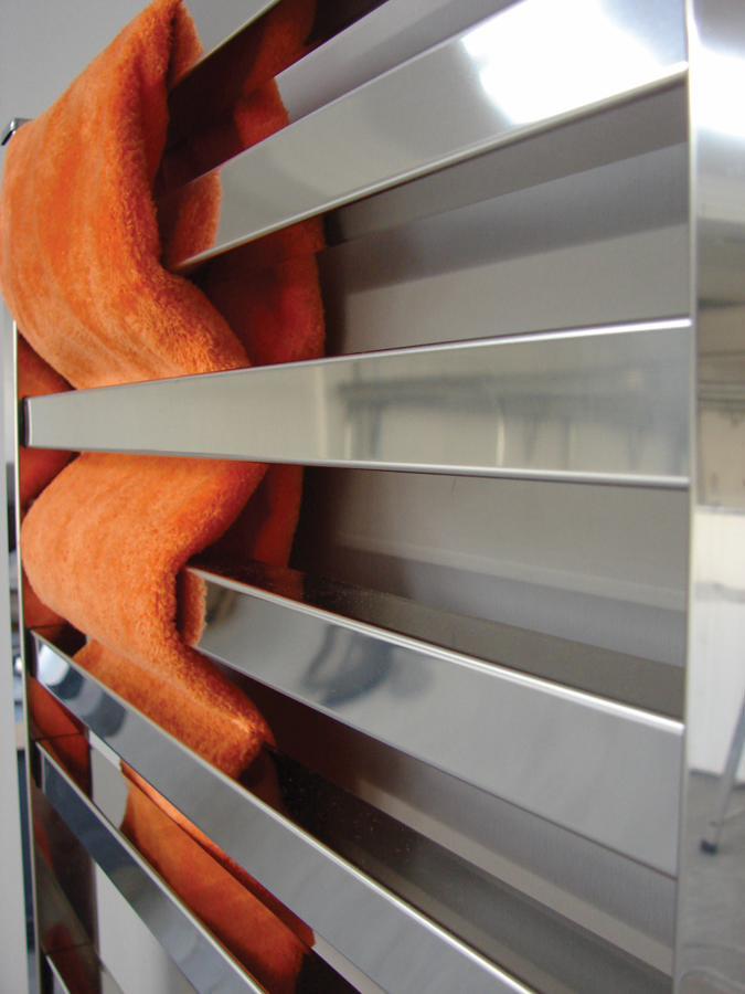 The dual-purpose Towel Warmer and Radiator with 12 polished horizontal bars, in a 6-6 configuration, features a modern design with square bars. It is perfect to warm and dry 2 towels, while warming the bathroom and keeping it dry and mildew free. Included is a Digital Heat Controller, which allows you to choose between 9 heat levels. This unit can be installed vertically, horizontally or upside down depending on the application. The distance from the wall can be adjusted between 4" and 4 3/4". Unit dimensions are 20"W x 33"H. Accessories such as Bathrobe Hangers and Programmable Timers can be added to the unit for extra functionality. Wiring is also available on the left side, by special order.