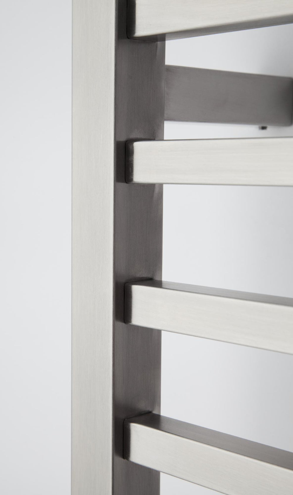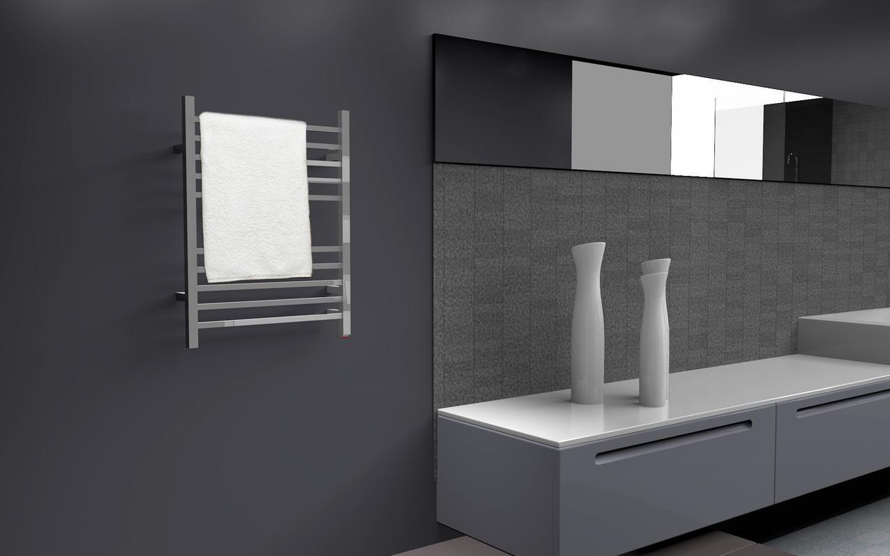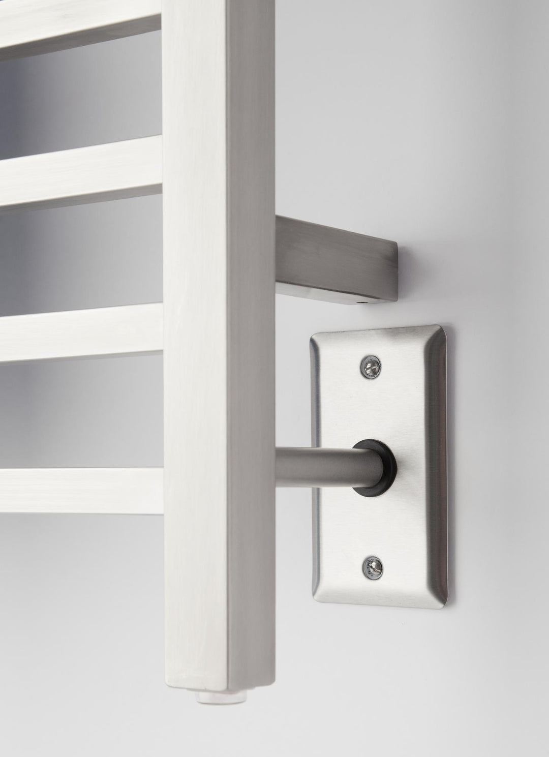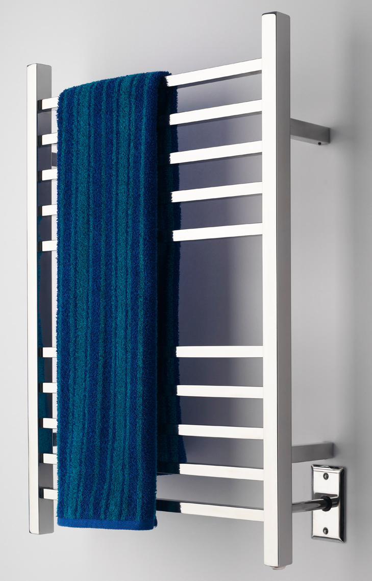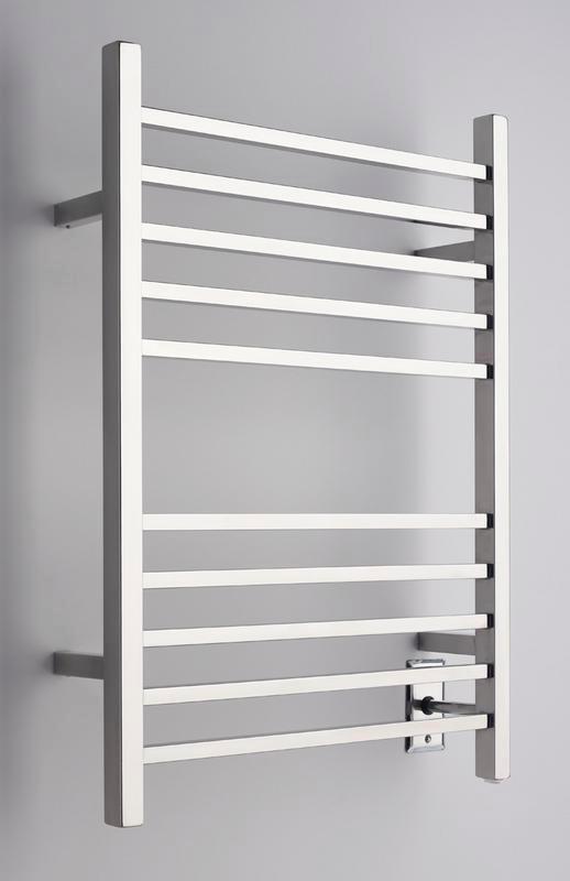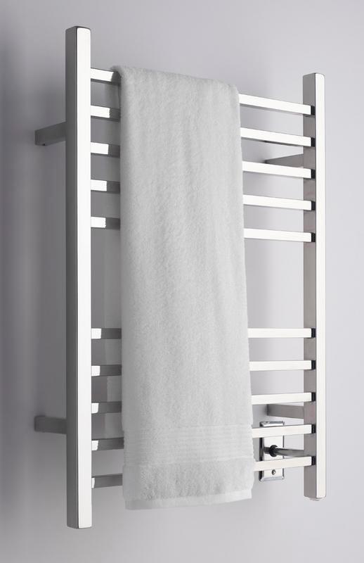 The modern style of this towel warmer in a polished finish with 10 square bars, in a 5-5 configuration, enhances any bathroom. Perfectly sized to accommodate 2 towels, it warms them up and dries them out while helping to reduce humidity in the bathroom. The integrated on/off switch and included hardwired switch means everything is included right out of the box. Unit dimensions are 24"W x 32"H. An optional programmable timer can be added for additional functionality.