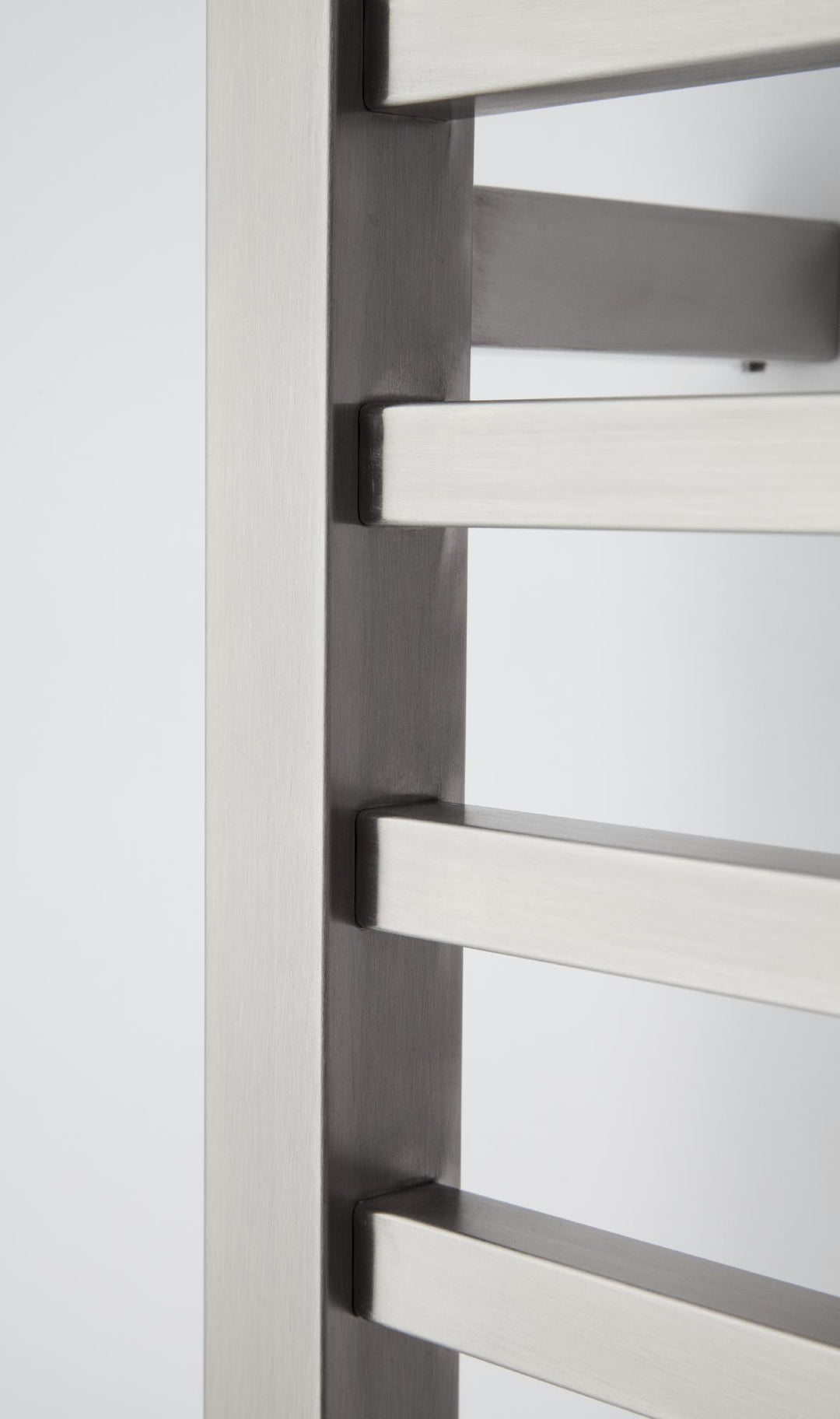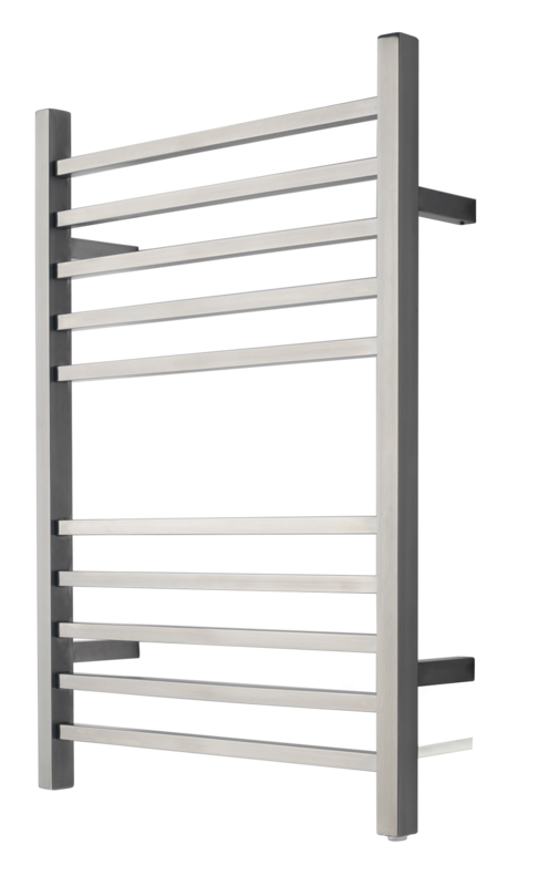 The modern style of this towel warmer in a brushed finish with 10 square bars, in a 5-5 configuration, enhances any bathroom. Perfectly sized to accommodate 2 towels, it warms them up and dries them out while helping to reduce humidity in the bathroom. This plug-in model requires no electrical work. Plug it in, turn it on using the integrated switch, and you are ready to go! Unit dimensions are 24"W x 32"H. An optional programmable timer can be added for additional functionality.