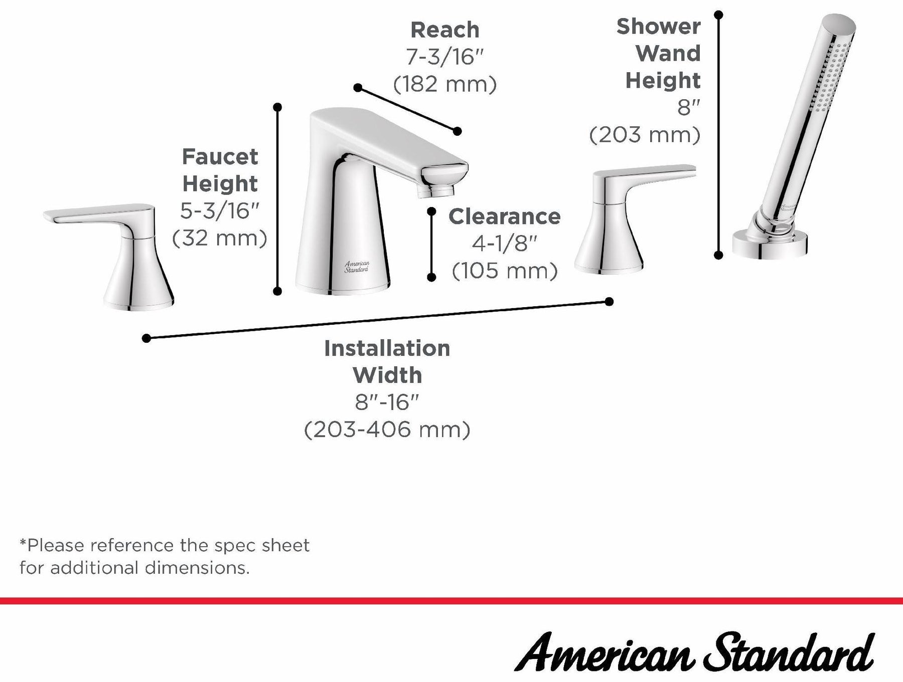 The Aspirations Deck-Mount Roman Tub Filler with Hand Shower from American Standard is a clean, minimalist tub filler, ideal in a contemporary bathroom. Sleek lever handles offer smooth, operation when filling the tub. Slender stick hand shower makes rinsing and cleaning the tub effortless. This 4-hole tub filler complements the entire Aspirations bathroom collection.