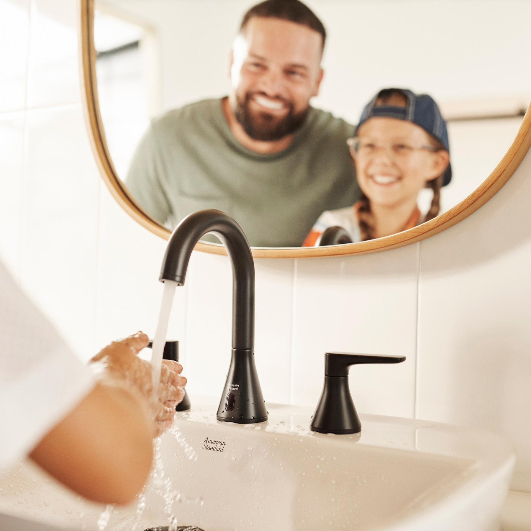 The Aspirations Touchless Widespread Bathroom Faucet from American Standard offers both hands-free and manual two-handle activation in a sleek, contemporary style. Equipped with touchless technology, this touchless faucet can be activated when hand motion is detected 6” away by infrared sensor for a more hygienic experience, or by turning the lever handles for more control. High-arc spout swivels 150° to provide complete clearance and access to the sink. This unique hybrid faucet provides maximum versatility and design excellence in today’s busiest bathroom.