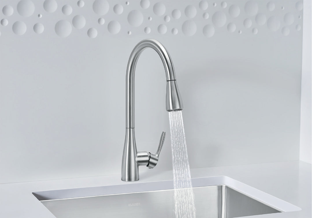 Organic style and high performance effortlessly combine to bring you the beautiful ATURA faucet. Designed with an iconic high-arc shape and a solid brass body, the ATURA blends professional faucet elements with subtle, elegant lines. This faucet features a pull-down spray, improving on the ability to clean your dishes and your sink bottom. With an easy to clean form and dual spray, the ATURA PULL-DOWN KITCHEN FAUCET is as attainable as it is convenient.