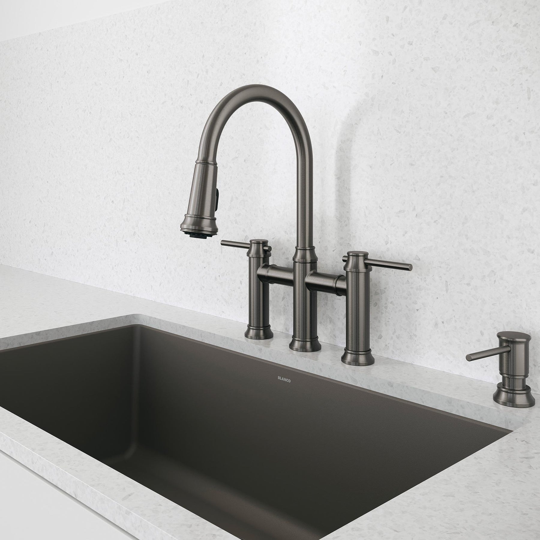 Empressa Bridge Kitchen Faucet with Pulldown Spray - Satin Dark Steel 443263 Blanco