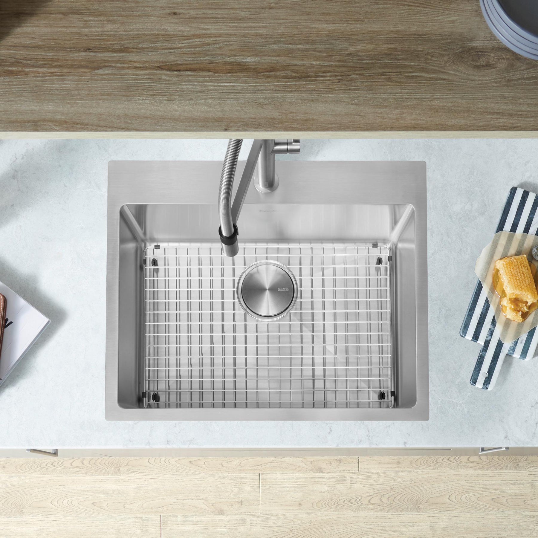 Everyday convenience meets modern design. The QUATRUS R15 25" Single Bowl Drop-in Stainless Steel Kitchen Sink is ideal for busy kitchens thanks to its single bowl configuration that allows for easy washing of pots and pans. German-engineered with corrosion-resistant stainless steel for long-lasting durability and 15 mm radius corners for low-maintenance cleaning —the QUATRUS R15 25" sink makes kitchen life easy. Combine the QUATRUS R15 25" sink with a BLANCO faucet and accessories to create a BLANCO UNIT; a seamless, fully integrated, kitchen solution designed to transform kitchen chores into joyful experiences. Everything you need to drink, prep and clean, all in one place.