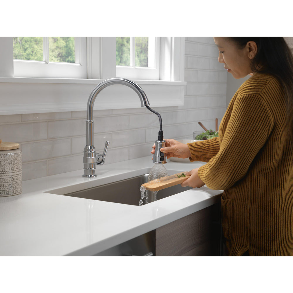 - The high-arc, gooseneck design swivels 360 degrees with a 20-in. retractable hose for added convenience during everyday kitchen tasks