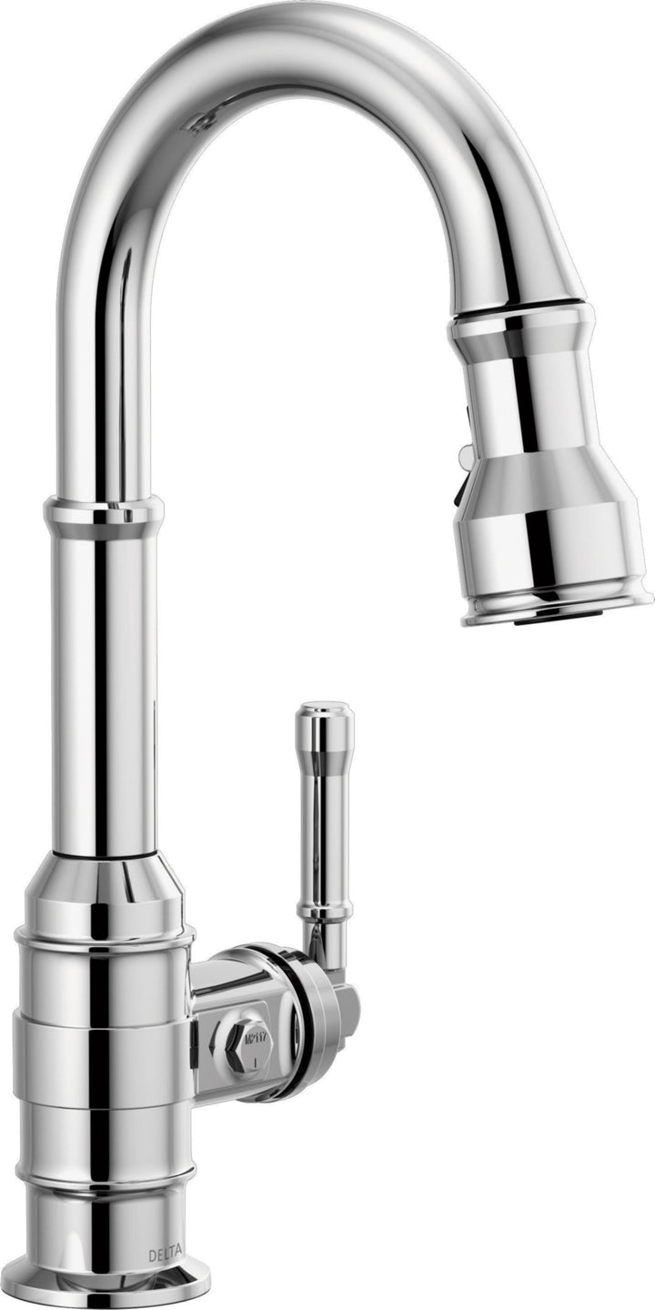 The powerful features of the Broderick Collection take center stage in the kitchen, with an industrial style that alludes to a rich heritage. The collection includes distinctive bridge faucet and pull-down spring spout faucet options that add a unique element to any kitchen. Styled after the rugged nuts and bolts of machinery, it serves as a true centerpiece in the kitchen. Kitchen sink faucets with Touch-Clean Spray Holes allow you to easily wipe away calcium and lime build-up with the touch of a finger. Delta kitchen faucets with DIAMOND Seal Technology perform like new for life with a patented design which reduces leak points, is less hassle to install and lasts twice as long as the industry standard*. You can install with confidence, knowing that Delta kitchen faucets are backed by our Lifetime Limited Warranty. *Industry standard is based on ASME A112.18.1 of 500,000 cycles.