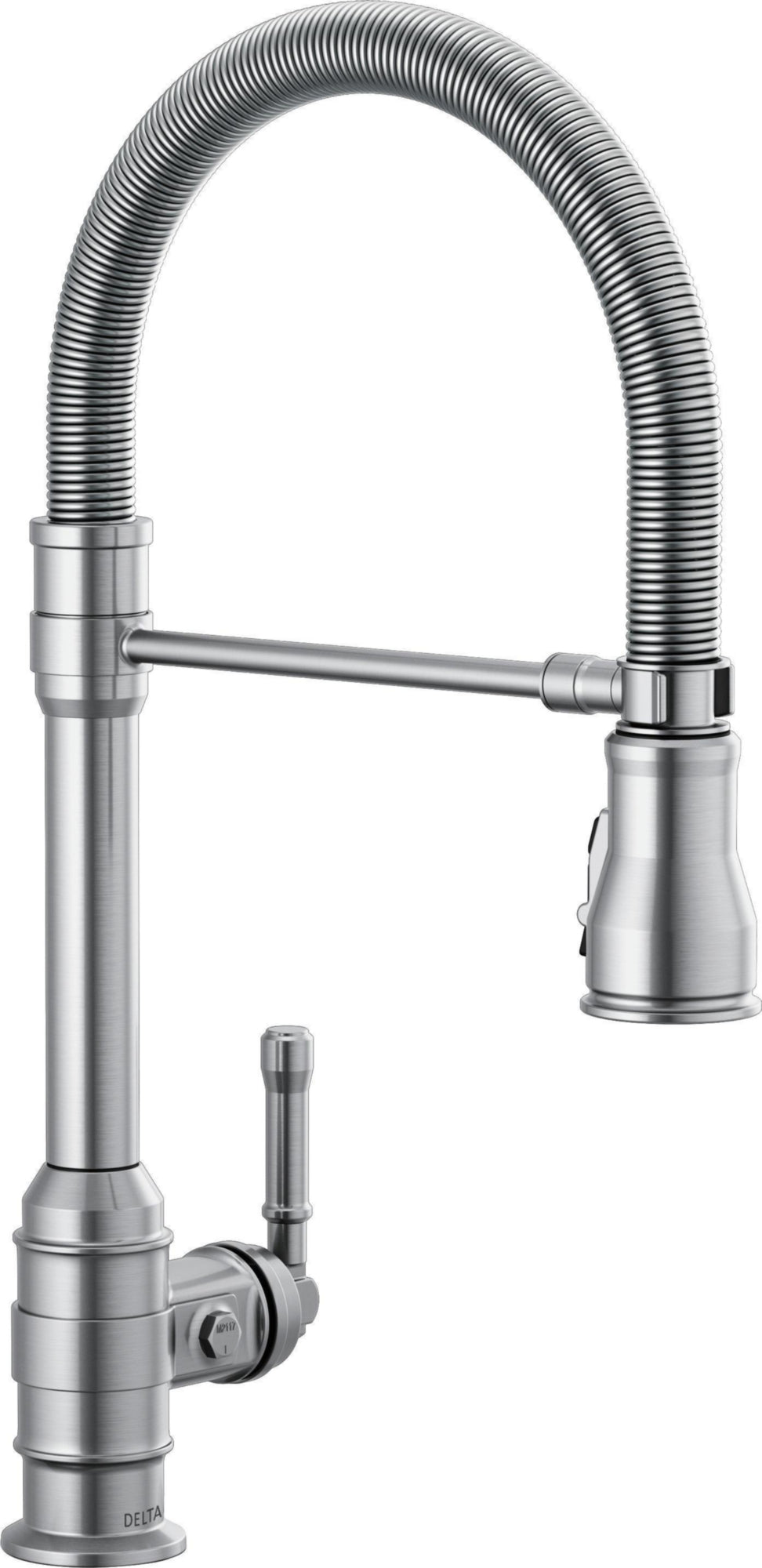 The powerful features of the Broderick Collection take center stage in the kitchen, with an industrial style that alludes to a rich heritage. The collection includes distinctive bridge faucet and pull-down spring spout faucet options that add a unique element to any kitchen. Styled after the rugged nuts and bolts of machinery, it serves as a true centerpiece in the kitchen. Take control of your kitchen with the flexible, spring-design undocking spout, which can be easily disconnected then magnetically re-docked for free range of motion. When docked, the Broderick Pro faucet still operates as a true pull-down faucet with MagnaTite Docking. Kitchen sink faucets with Touch-Clean Spray Holes allow you to easily wipe away calcium and lime build-up with the touch of a finger. Delta ShieldSpray Technology cleans with laser-like precision while containing mess and splatter. A concentrated jet powers away stubborn messes while an innovative shield of water contains splatter and clears off the mess, so you can spend less time soaking, scrubbing and shirt swapping. Delta kitchen faucets with DIAMOND Seal Technology perform like new for life with a patented design which reduces leak points, is less hassle to install and lasts twice as long as the industry standard*. Kitchen sink faucets with Touch-Clean Spray Holes allow you to easily wipe away calcium and lime build-up with the touch of a finger. You can install with confidence, knowing that Delta kitchen faucets are backed by our Lifetime Limited Warranty.