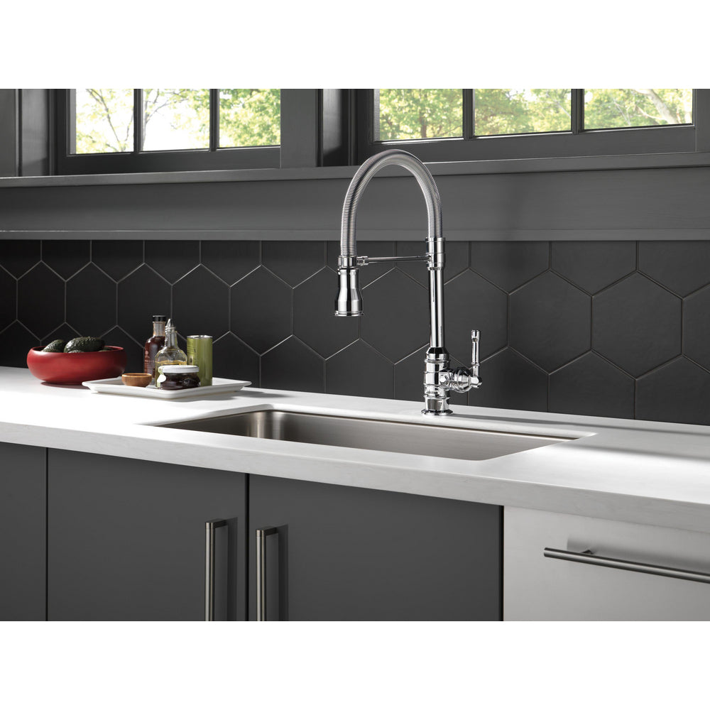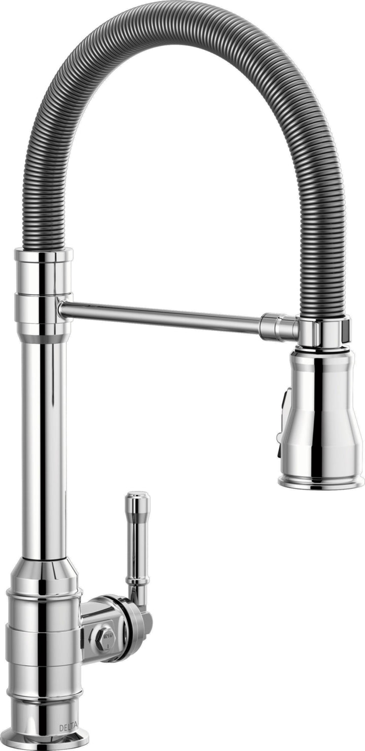 The powerful features of the Broderick Collection take center stage in the kitchen, with an industrial style that alludes to a rich heritage. The collection includes distinctive bridge faucet and pull-down spring spout faucet options that add a unique element to any kitchen. Styled after the rugged nuts and bolts of machinery, it serves as a true centerpiece in the kitchen. Take control of your kitchen with the flexible, spring-design undocking spout, which can be easily disconnected then magnetically re-docked for free range of motion. When docked, the Broderick Pro faucet still operates as a true pull-down faucet with MagnaTite Docking. Kitchen sink faucets with Touch-Clean Spray Holes allow you to easily wipe away calcium and lime build-up with the touch of a finger. Delta ShieldSpray Technology cleans with laser-like precision while containing mess and splatter. A concentrated jet powers away stubborn messes while an innovative shield of water contains splatter and clears off the mess, so you can spend less time soaking, scrubbing and shirt swapping. Delta kitchen faucets with DIAMOND Seal Technology perform like new for life with a patented design which reduces leak points, is less hassle to install and lasts twice as long as the industry standard*. Kitchen sink faucets with Touch-Clean Spray Holes allow you to easily wipe away calcium and lime build-up with the touch of a finger. You can install with confidence, knowing that Delta kitchen faucets are backed by our Lifetime Limited Warranty.