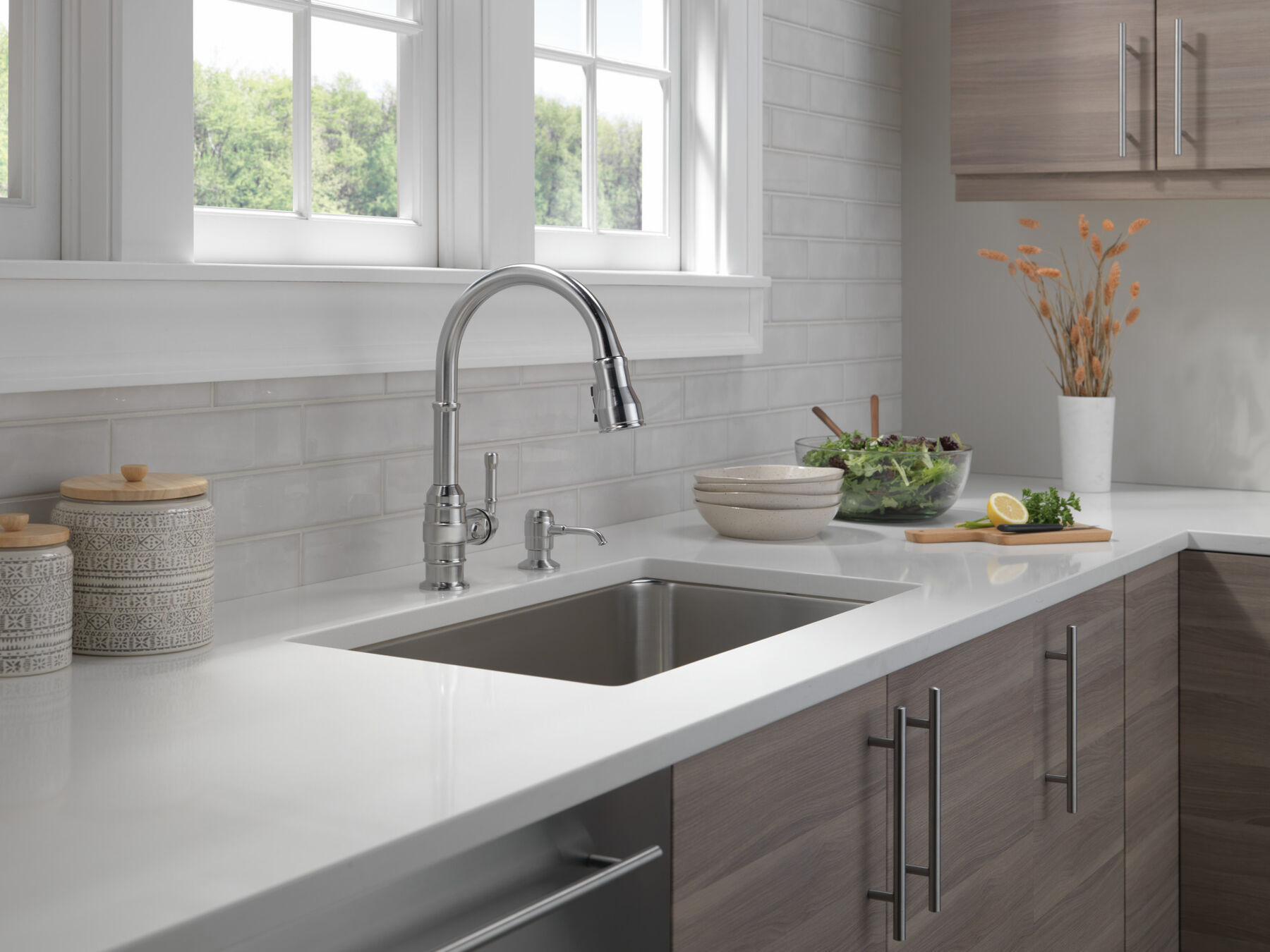 The powerful features of the Broderick Collection take center stage in the kitchen, with an industrial style that alludes to a rich heritage. The collection includes distinctive bridge faucet and pull-down spring spout faucet options that add a unique element to any kitchen. Styled after the rugged nuts and bolts of machinery, it serves as a true centerpiece in the kitchen. You can install with confidence, knowing that Delta kitchen faucets are backed by our Lifetime Limited Warranty.
