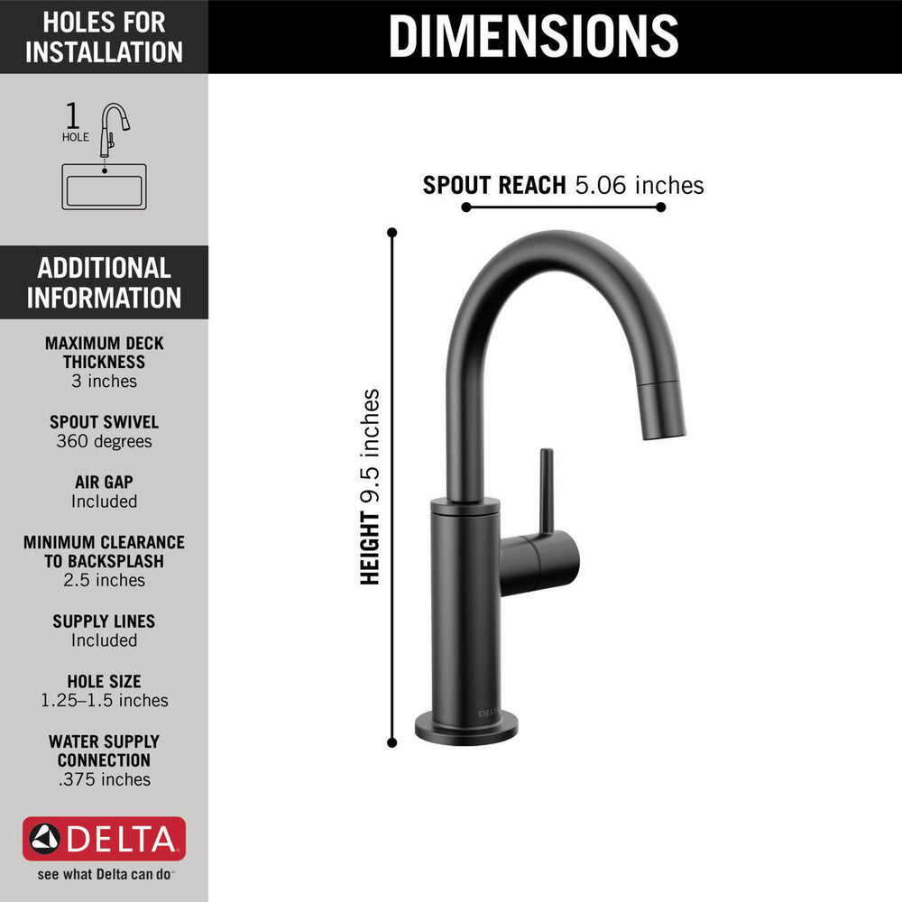 Delta Beverage Faucets conveniently provide purified drinking water in a wide range of styles and finishes. Air gaps are integrated within the faucet for easy use with a reverse osmosis system. Delta Beverage Faucets are for cold water installation only and ideal for any reverse osmosis (RO), under the counter water filtration systems, or chillers but cannot be used with Instant Hot tanks. If installation does not require an air gap, the connection can simply be cut or coiled out of the way under the deck. Perfect for the pantry, butler's kitchen, or bar, but stylish enough to be featured next to your main faucet. Delta faucets with DIAMOND Seal Technology perform like new for life with a patented design which reduces leak points, is less hassle to install and lasts twice as long as the industry standard. You can install with confidence, knowing that Delta beverage faucets are backed by our Lifetime Limited Warranty.