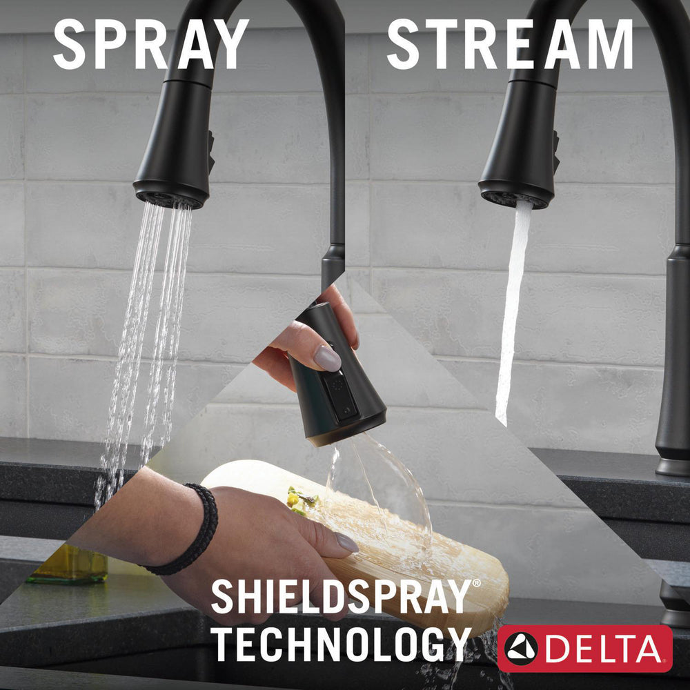 A contemporary take on traditional styling, the Coranto Kitchen Collection brings everyday refinement to a space with subtle design details that nod to both the past and the present. Delta MagnaTite Docking uses a powerful integrated magnet to set your pull down sprayer precisely into place and hold it there so it stays docked when not in use. Delta ShieldSpray Technology cleans with laser-like precision while containing mess and splatter. A concentrated jet powers away stubborn messes while an innovative shield of water contains splatter and clears off the mess, so you can spend less time soaking, scrubbing and shirt swapping. Delta kitchen faucets with DIAMOND Seal Technology perform like new for life with a patented design which reduces leak points, is less hassle to install and lasts twice as long as the industry standard*. Kitchen sink faucets with Touch-Clean Spray Holes allow you to easily wipe away calcium and lime build-up with the touch of a finger. You can install with confidence, knowing that Delta kitchen faucets are backed by our Lifetime Limited Warranty. *Industry standard is based on ASME A112.18.1 of 500,000 cycles.