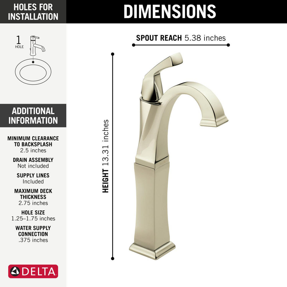 The clean lines and geometric forms of the Dryden Collection, derived from style cues of the Art Deco period, offer a simple yet sophisticated design. Delta faucets with DIAMOND Seal Technology perform like new for life with a patented design that reduces leak points, is less hassle to install and lasts twice as long as the industry standard. Delta WaterSense labeled faucets use at least 20% less water than the industry standard — helping you save water without compromising performance. You can install with confidence, knowing that Delta faucets are backed by our Lifetime Limited Warranty.