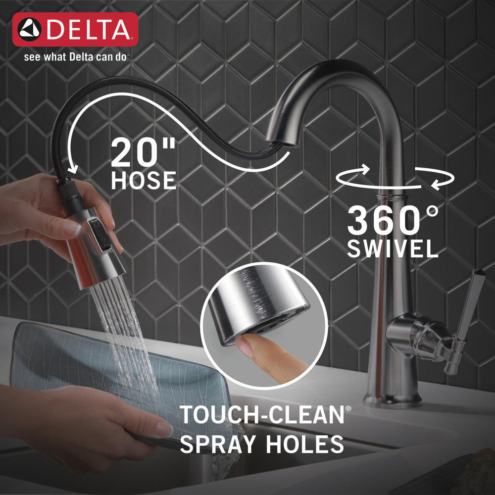 The defined ridges of the Emmeline Kitchen Collection?s diamond-shaped spout cut a streamlined profile, balanced by captivating details that lend an elemental sense of old-world flair. Kitchen sink faucets with Touch-Clean Spray Holes allow you to easily wipe away calcium and lime build-up with the touch of a finger. Delta Lumicoat Finishes easily wipe clean without the need for cleaners or chemicals and are guaranteed to resist mineral buildup and hard water stains. The ultra-sleek surface repels liquids, resisting water spots and staying cleaner longer, so your faucet stays beautiful. Delta kitchen faucets with DIAMOND Seal Technology perform like new for life with a patented design which reduces leak points, is less hassle to install and lasts twice as long as the industry standard*. You can install with confidence, knowing that Delta kitchen faucets are backed by our Lifetime Limited Warranty.