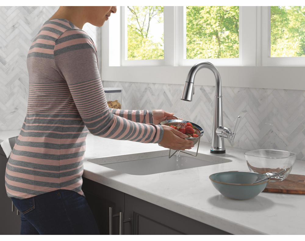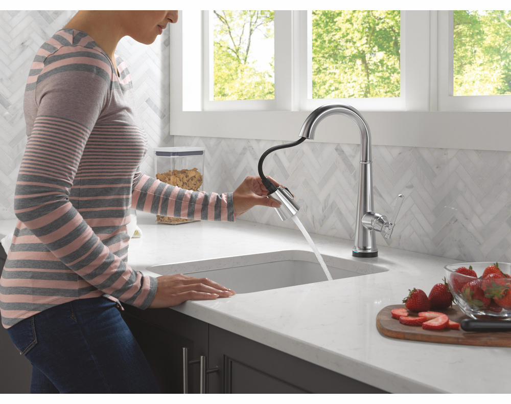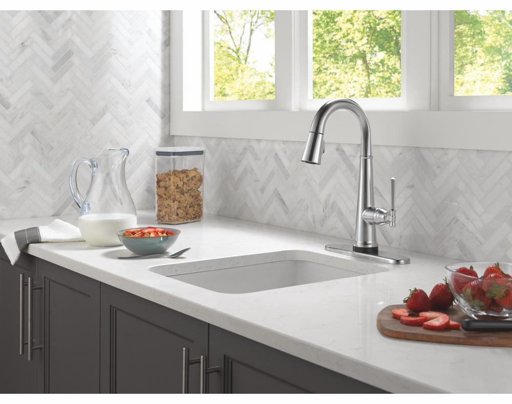 The defined ridges of the Emmeline Kitchen Collection’s diamond-shaped spout cut a streamlined profile, balanced by captivating details that lend an elemental sense of old-world flair. Delta Touch2O faucets with Touchless Technology help keep germs and mess off your kitchen faucet and provides easy water control 3 ways: simply place your hand near the faucet, tap the faucet surface, or use standard handle activation. The TempSense LED light changes color to alert you to the water’s temperature and eliminate any possible surprises or discomfort. MagnaTite Docking uses a powerful integrated magnet to pull your faucet spray wand precisely into place and hold it there so it stays docked when not in use. Delta faucets with Diamond Seal Technology perform like new for life with a patented design which reduces leak points, is less hassle to install and lasts twice as long as the industry standard. You can install with confidence, knowing that Delta faucets are backed by our Lifetime Limited Warranty.