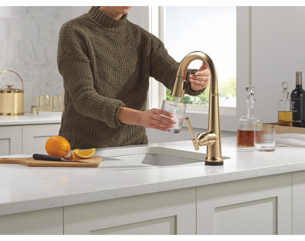 The defined ridges of the Emmeline Kitchen Collection’s diamond-shaped spout cut a streamlined profile, balanced by captivating details that lend an elemental sense of old-world flair. Delta Touch2O faucets with Touchless Technology help keep germs and mess off your kitchen faucet and provides easy water control 3 ways: simply place your hand near the faucet, tap the faucet surface, or use standard handle activation. The TempSense LED light changes color to alert you to the water’s temperature and eliminate any possible surprises or discomfort. MagnaTite Docking uses a powerful integrated magnet to pull your faucet spray wand precisely into place and hold it there so it stays docked when not in use. Delta faucets with Diamond Seal Technology perform like new for life with a patented design which reduces leak points, is less hassle to install and lasts twice as long as the industry standard. You can install with confidence, knowing that Delta faucets are backed by our Lifetime Limited Warranty.