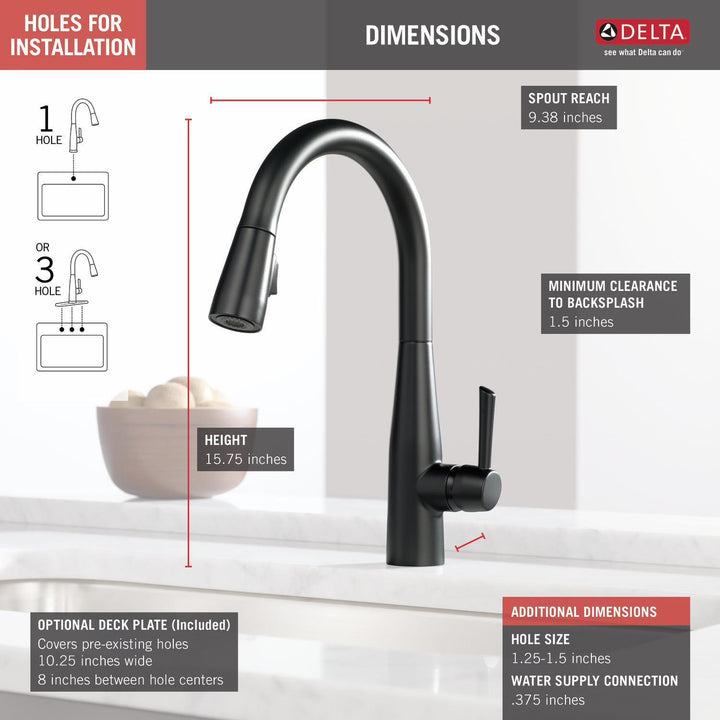 Delta MagnaTite Docking uses a powerful integrated magnet to pull your faucet spray wand precisely into place and hold it there so it stays docked when not in use. Delta faucets with DIAMOND Seal Technology perform like new for life with a patented design which reduces leak points, is less hassle to install and lasts twice as long as the industry standard*. Kitchen faucets with Touch-Clean Spray Holes allow you to easily wipe away calcium and lime build-up with the touch of a finger. You can install with confidence, knowing that Delta faucets are backed by our Lifetime Limited Warranty. *Industry standard is based on ASME A112.18.1 of 500,000 cycles.