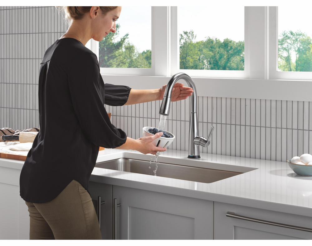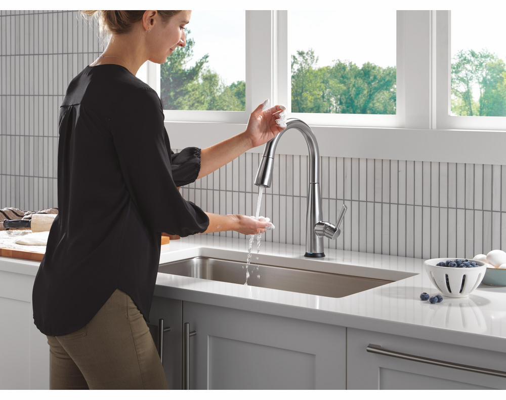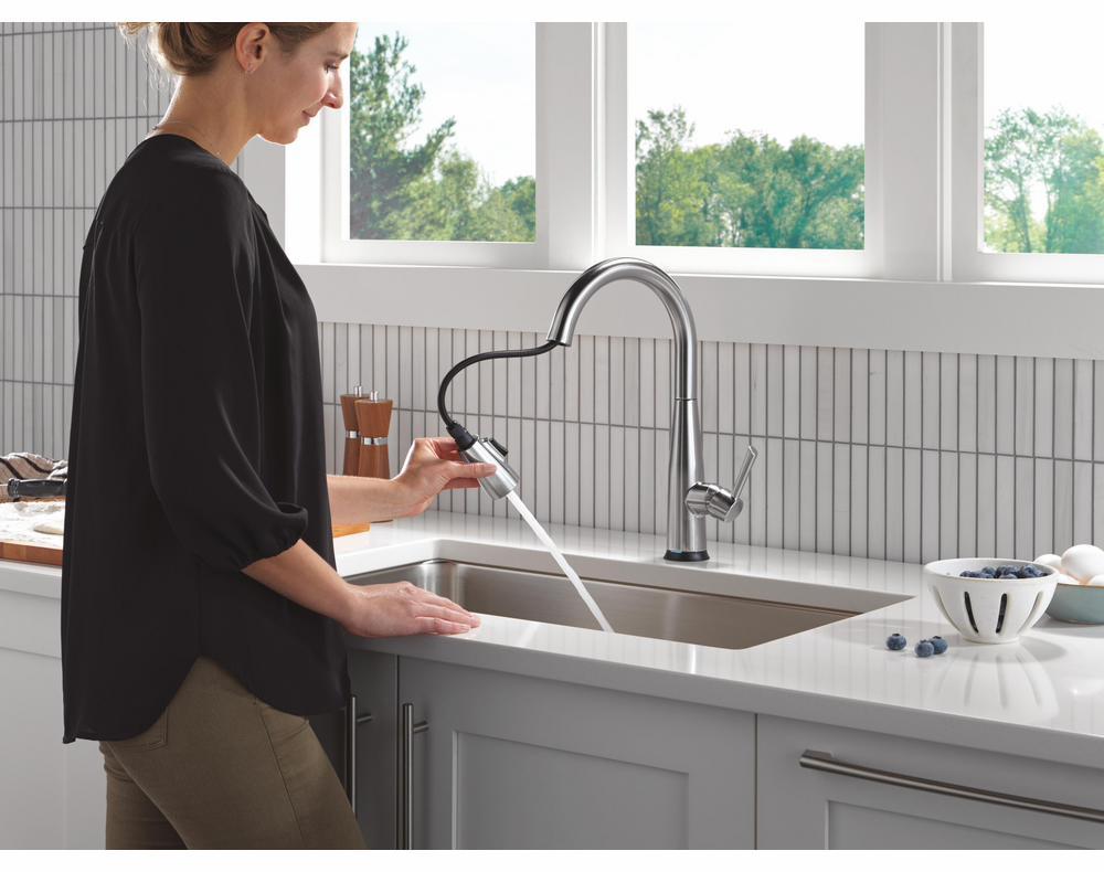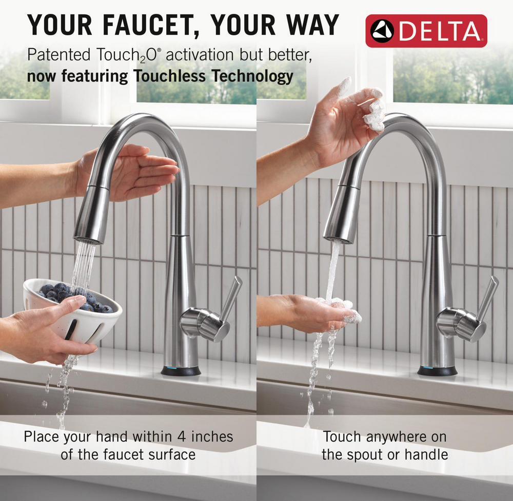 The Delta Essa Collection is a soft, modern take on euro design with subtle detailing accents. Delta Touch2O faucets with Touchless Technology help keep germs and mess off your kitchen faucet and provides easy water control 3 ways: simply place your hand near the faucet, tap the faucet surface, or use standard handle activation. The TempSense LED light changes color to alert you to the water’s temperature and eliminate any possible surprises or discomfort. MagnaTite Docking uses a powerful integrated magnet to pull your faucet spray wand precisely into place and hold it there so it stays docked when not in use. Delta faucets with Diamond Seal Technology perform like new for life with a patented design which reduces leak points, is less hassle to install and lasts twice as long as the industry standard. You can install with confidence, knowing that Delta faucets are backed by our Lifetime Limited Warranty.