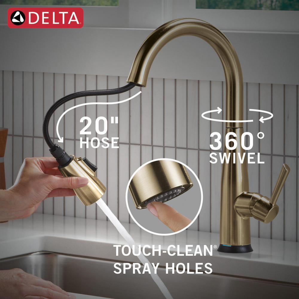 The Delta Essa Collection is a soft, modern take on euro design with subtle detailing accents. Delta Touch2O faucets with Touchless Technology help keep germs and mess off your kitchen faucet and provides easy water control 3 ways: simply place your hand near the faucet, tap the faucet surface, or use standard handle activation. The TempSense LED light changes color to alert you to the water’s temperature and eliminate any possible surprises or discomfort. MagnaTite Docking uses a powerful integrated magnet to pull your faucet spray wand precisely into place and hold it there so it stays docked when not in use. Delta faucets with Diamond Seal Technology perform like new for life with a patented design which reduces leak points, is less hassle to install and lasts twice as long as the industry standard. You can install with confidence, knowing that Delta faucets are backed by our Lifetime Limited Warranty.