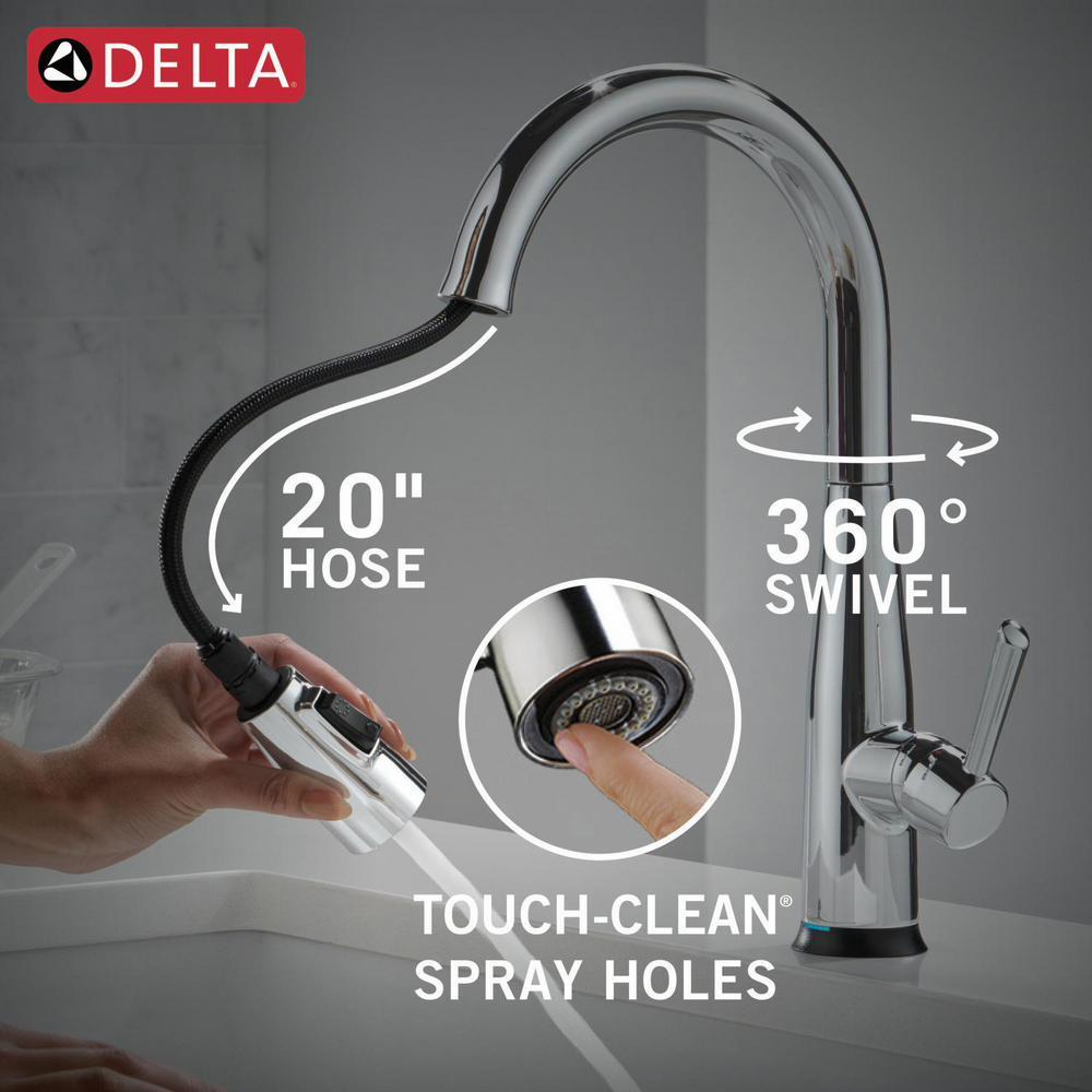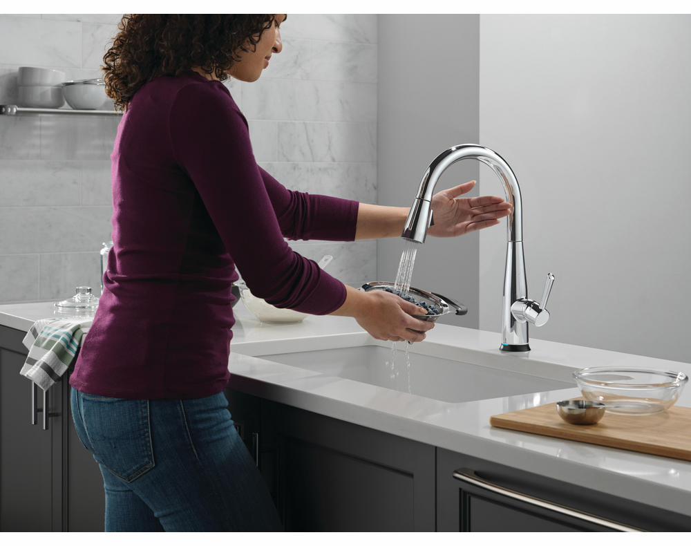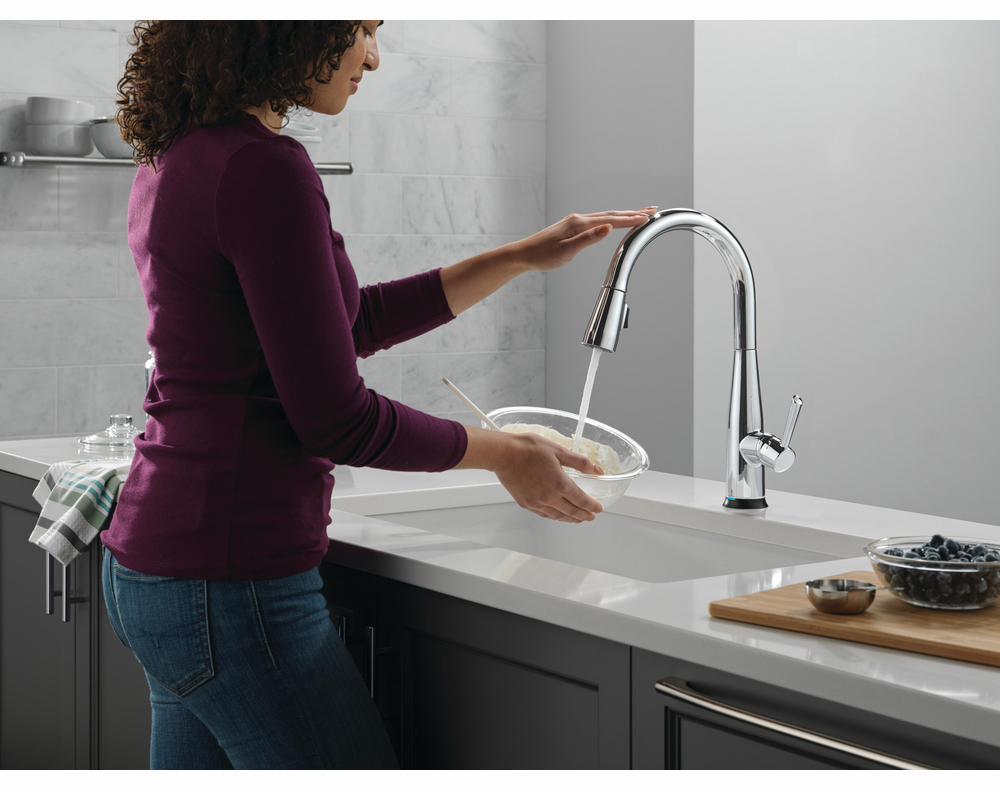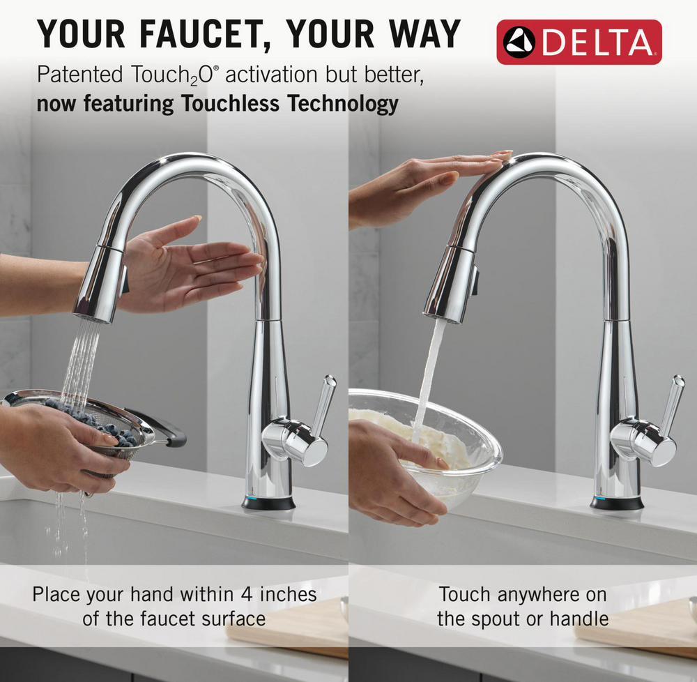 The Delta Essa Collection is a soft, modern take on euro design with subtle detailing accents. Delta Touch2O faucets with Touchless Technology help keep germs and mess off your kitchen faucet and provides easy water control 3 ways: simply place your hand near the faucet, tap the faucet surface, or use standard handle activation. The TempSense LED light changes color to alert you to the water’s temperature and eliminate any possible surprises or discomfort. MagnaTite Docking uses a powerful integrated magnet to pull your faucet spray wand precisely into place and hold it there so it stays docked when not in use. Delta faucets with Diamond Seal Technology perform like new for life with a patented design which reduces leak points, is less hassle to install and lasts twice as long as the industry standard. You can install with confidence, knowing that Delta faucets are backed by our Lifetime Limited Warranty.