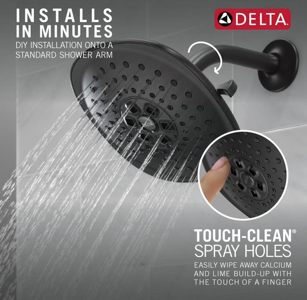 Replacing your shower head is one of the quickest, simplest upgrades you can make to your shower. Our shower heads feature a wide range of styles and innovations, and install in less than 20 minutes - no special tools required. Delta H2Okinetic Showers look different because they are different. Using advanced technology, H2Okinetic showers sculpt water into a unique wave pattern, giving you 3X the coverage of a standard shower head.* The end result is a shower that provides more coverage, more warmth and more intensity for a truly drenching shower experience. So go ahead and indulge, because now you can enjoy the feeling of more water without using more water. While other products may gather unsightly mineral build-up over time, Delta soft rubber Touch-Clean spray holes allow any mineral residue to simply be wiped away for an instantly refreshed look – with no need for soaking or the aid of chemical cleaners. The pause setting gives you ample space for shaving, lathering and other shower tasks, then easily restarts the water with the temperature where you left off. This spray setting helps you conserve water, so you can worry less about depleting your supply of hot water - and you help the environment too. Delta WaterSense labeled faucets, showers and toilets use at least 20% less water than the industry standard—saving you money without compromising performance. You can install with confidence knowing that Delta backs this adjustable slide bar with a lifetime limited warranty.