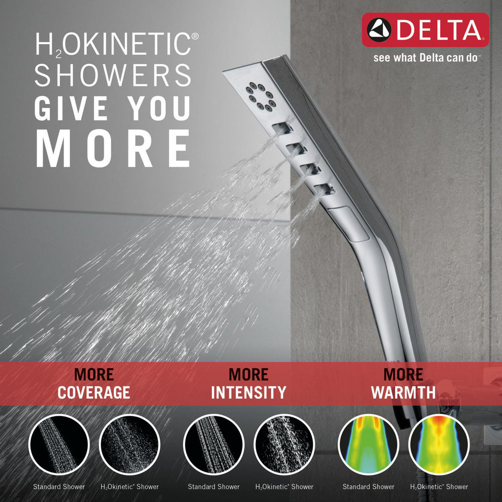 Experience a better shower with the control and flexibility of a Delta hand shower. Great for showering yourself or your loved ones and pets, as well as for keeping your shower and tub clean. Delta H2Okinetic Showers with PowerDrench Spray look different because they are different. H2Okinetic showers are powered by an innovative technology that sculpts the water into a unique wave pattern, giving you the feeling of more water and water pressure. Delta WaterSense labeled faucets, showers and toilets use at least 20% less water than the industry standard — helping you save water without compromising performance. You can install with confidence, knowing that Delta showers are backed by our Lifetime Limited Warranty.