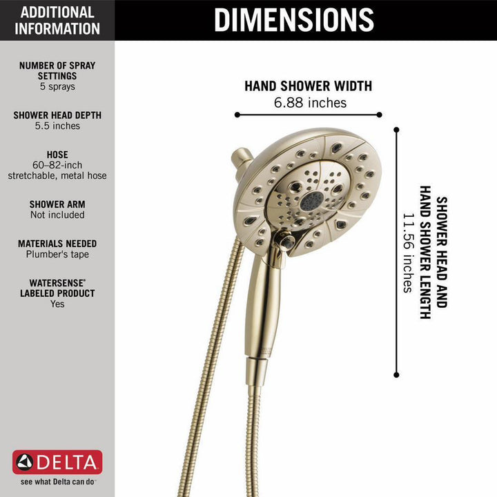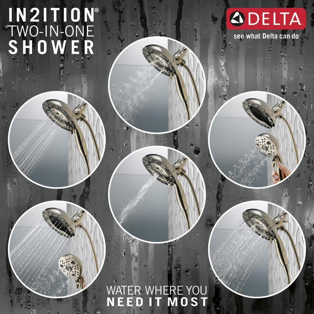 The Delta In2ition Two-in-One Shower features a detachable hand shower which can be used separately from or simultaneously with the shower head. This integrated dual-functionality gives you maximum flexibility without sacrificing warmth, as you can choose to have water streaming from the shower head only, the hand shower only or both the shower head and hand shower at once. Delta MagnaTite Docking uses a powerful integrated magnet to pull your In2ition hand shower precisely into place and hold it there so it stays docked when not in use. Delta WaterSense labeled faucets, showers and toilets use at least 20% less water than the industry standard — helping you save water without compromising performance. You can install with confidence, knowing that Delta showers are backed by our Lifetime Limited Warranty.