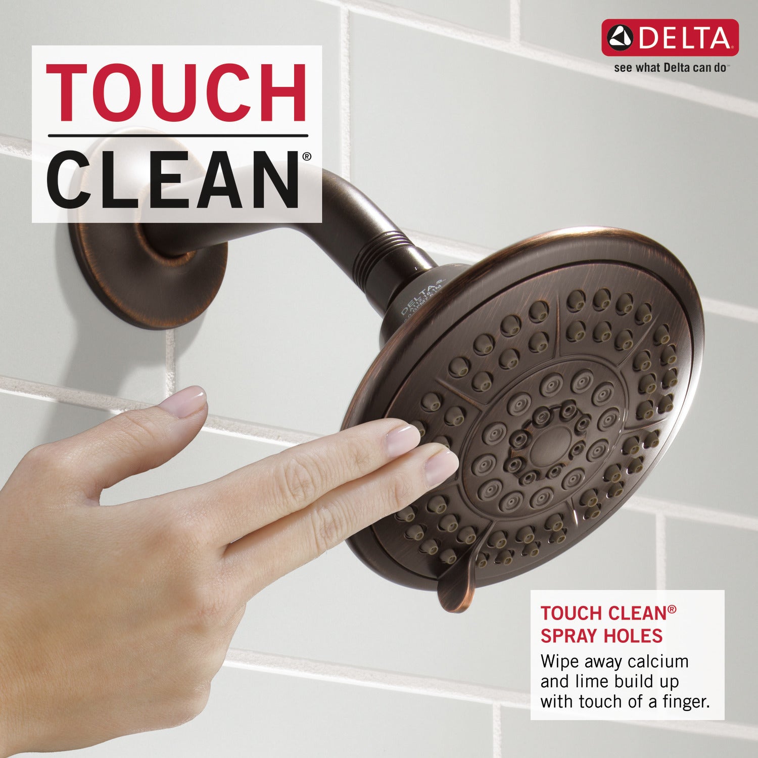 - Soft, rubber Touch-Clean spray holes allow you to easily wipe away calcium and lime build-up from the spray face of your shower head and hand shower with the touch of a finger