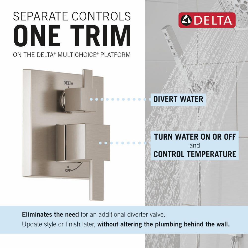 This Modern Collection bundle offers a streamlined, contemporary design and the components you need for a complete shower. Delta showers with Monitor pressure balance valves are engineered to make sure you don’t experience a sudden and possibly unsafe change in water temperature as a result of running water elsewhere, such as using a dishwasher, flushing a toilet or running a washing machine. While other products may gather unsightly mineral buildup over time, soft rubber Touch-Clean spray holes allow any mineral residue to simply be wiped away for an instantly refreshed look — with no need for soaking or the aid of chemical cleaners. WaterSense labeled faucets, showers and toilets use at least 20% less water than the industry standard — helping you save water without compromising performance. You can install with confidence, knowing Delta products are backed by our Limited Lifetime Warranty.