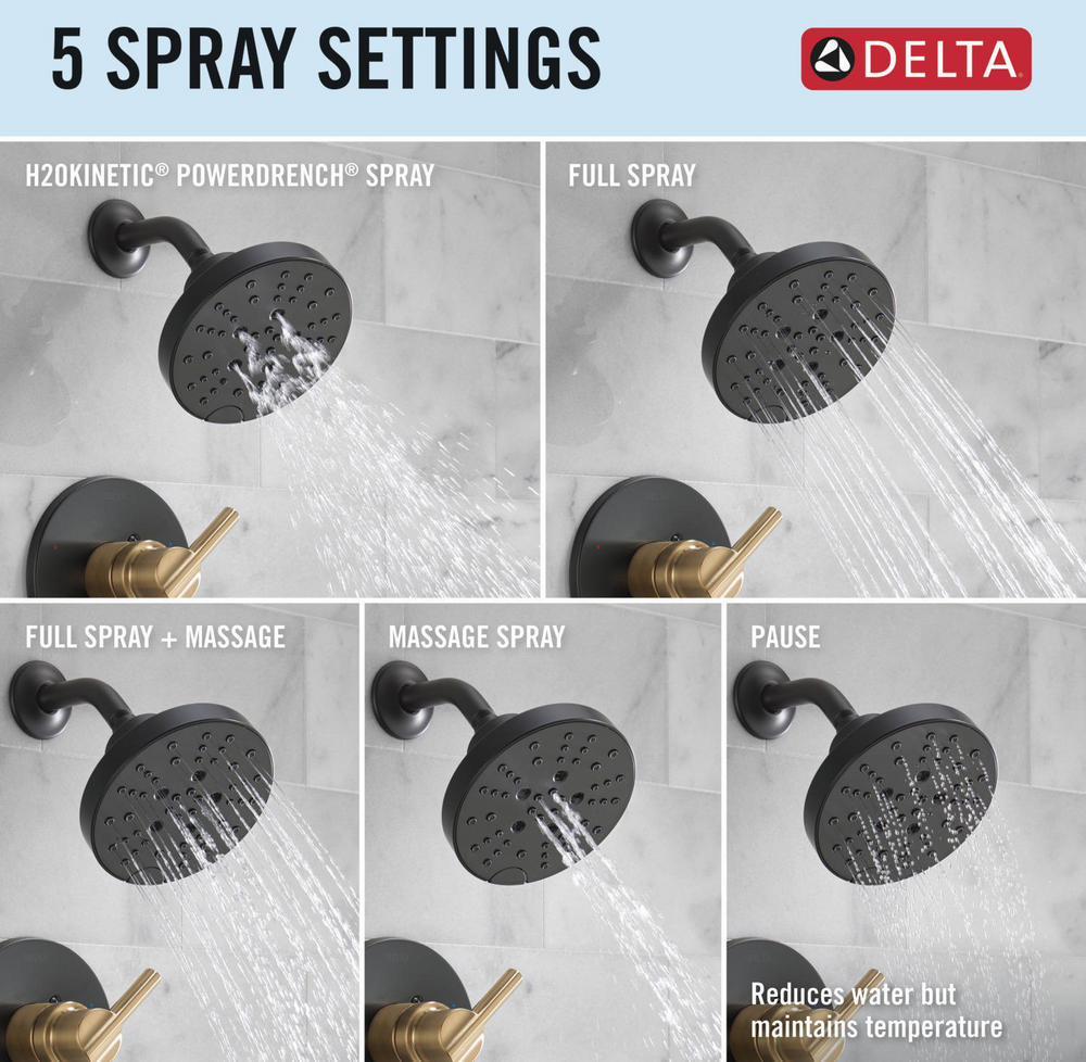 - Spray settings include: H2OKinetic spray, Full Body spray, Full Spray with Massage, Massaging spray, and Pause