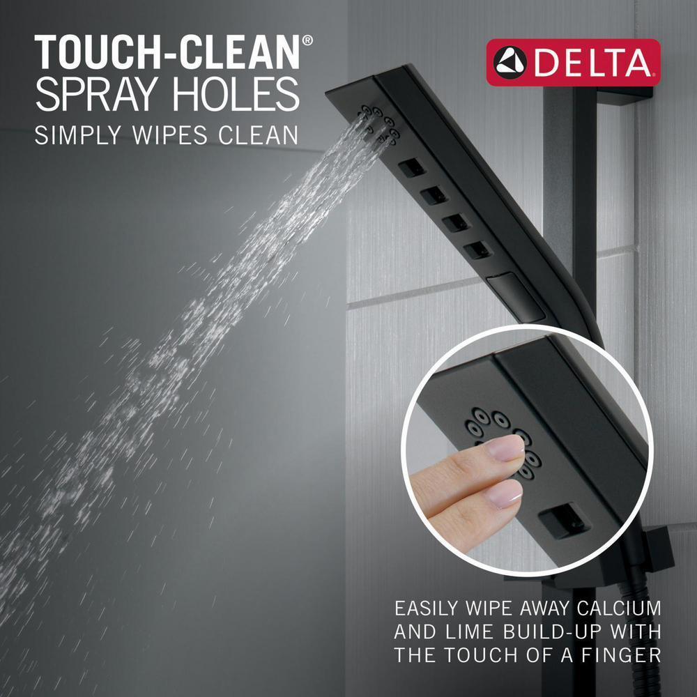 - Soft, rubber Touch-Clean® spray holes allow you to easily wipe away calcium and lime build-up from the spray face of your shower head and hand shower with the touch of a finger
