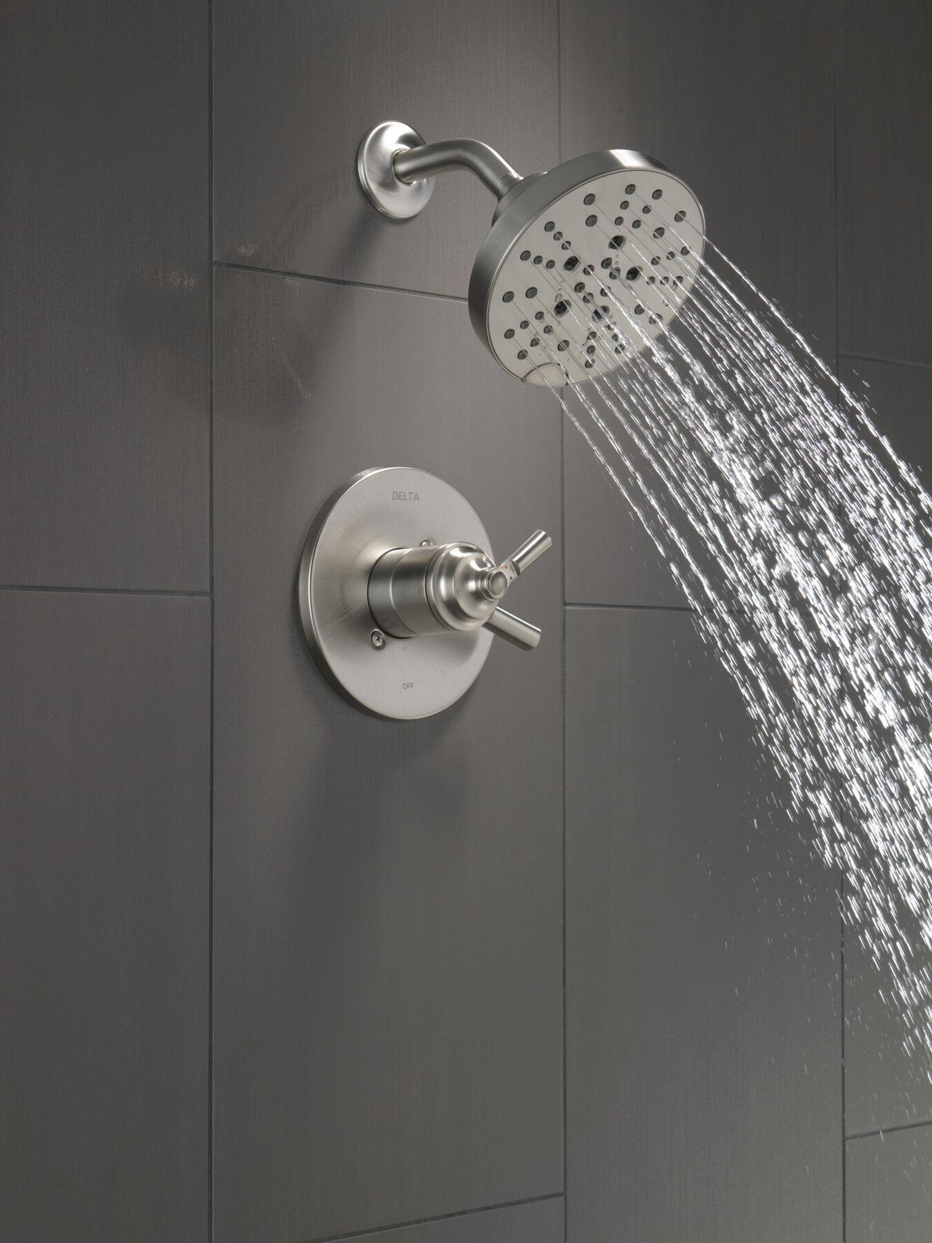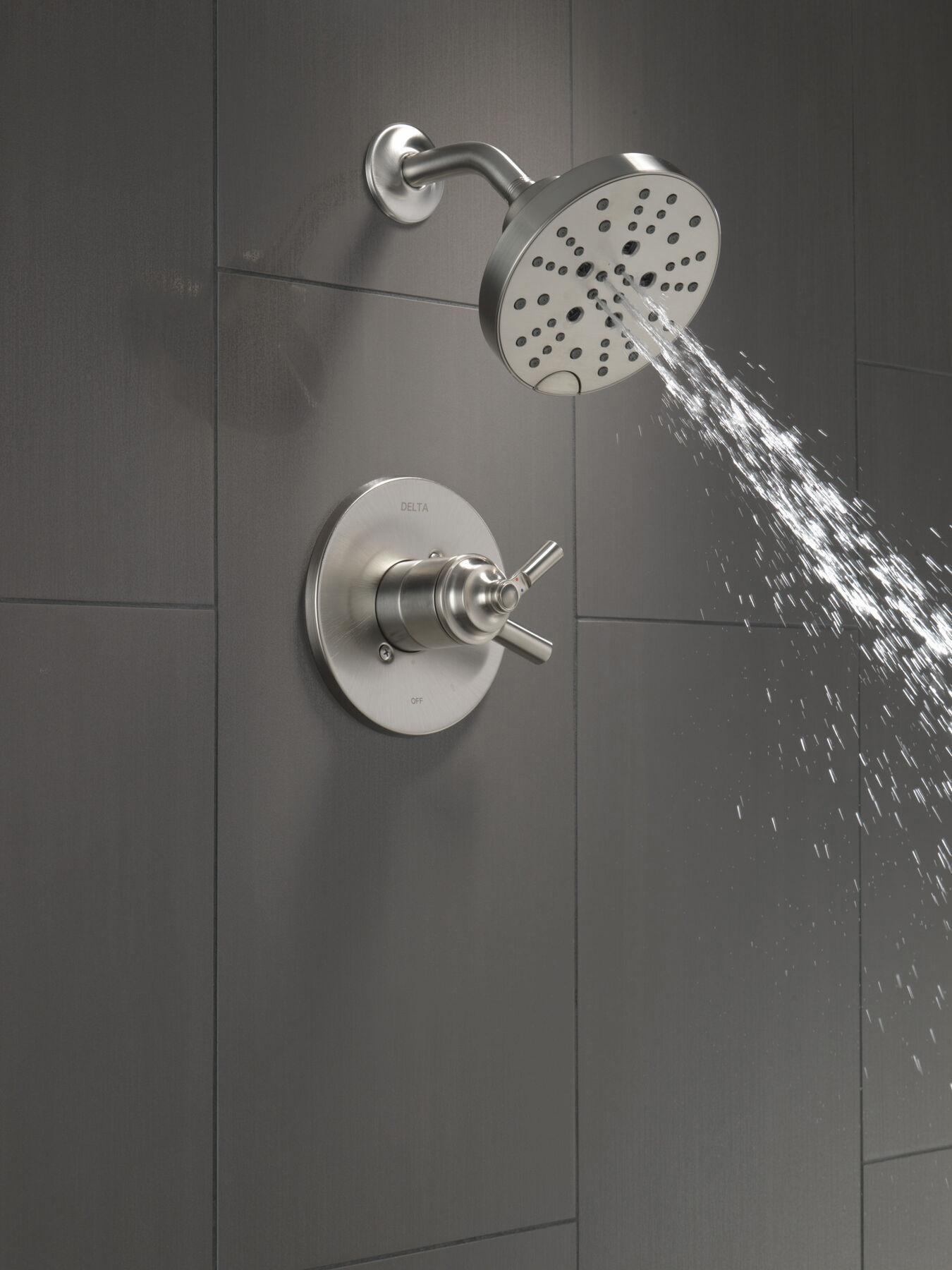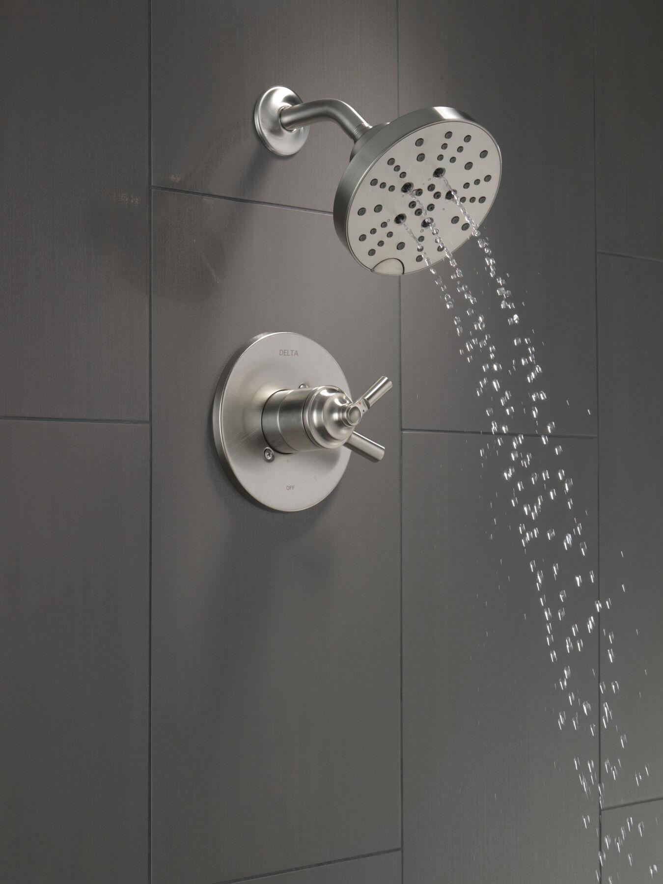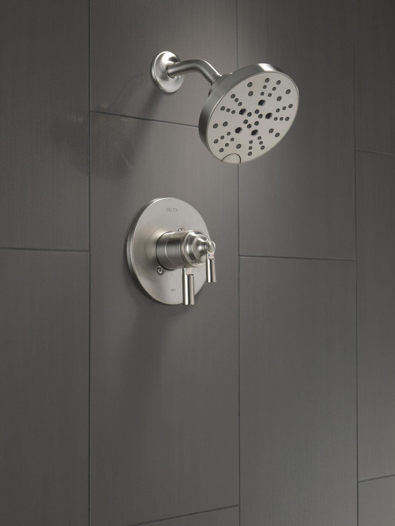 The Saylor Bath Collection is an intriguing blend of traditional and contemporary design elements with strong, geometric forms and hints of industrial style in the handles. With separate handles for volume and temperature control, this Delta tub/shower provides a more refined showering experience. Simply set the water at your preferred temperature and turn the shower on or off with the volume control handle—without interrupting your set temperature. Delta showers with Monitor pressure-balance valves are engineered to make sure you don’t experience a sudden and possibly unsafe change in water temperature as a result of running water elsewhere, such as using a dishwasher, flushing a toilet or running a washing machine. While other products may gather unsightly mineral buildup over time, Delta soft rubber Touch-Clean spray holes allow any mineral residue to simply be wiped away for an instantly refreshed look — with no need for soaking or the aid of chemical cleaners. The pause setting gives you ample space for shaving, lathering and other shower tasks, then easily restarts the water with the temperature where you left off. This spray setting helps you conserve water, so you can worry less about depleting your supply of hot water — and you help the environment too. Delta WaterSense labeled faucets, showers and toilets use at least 20% less water than the industry standard — helping you save water without compromising performance. You can install with confidence, knowing Delta products are backed by our Lifetime Limited Warranty.