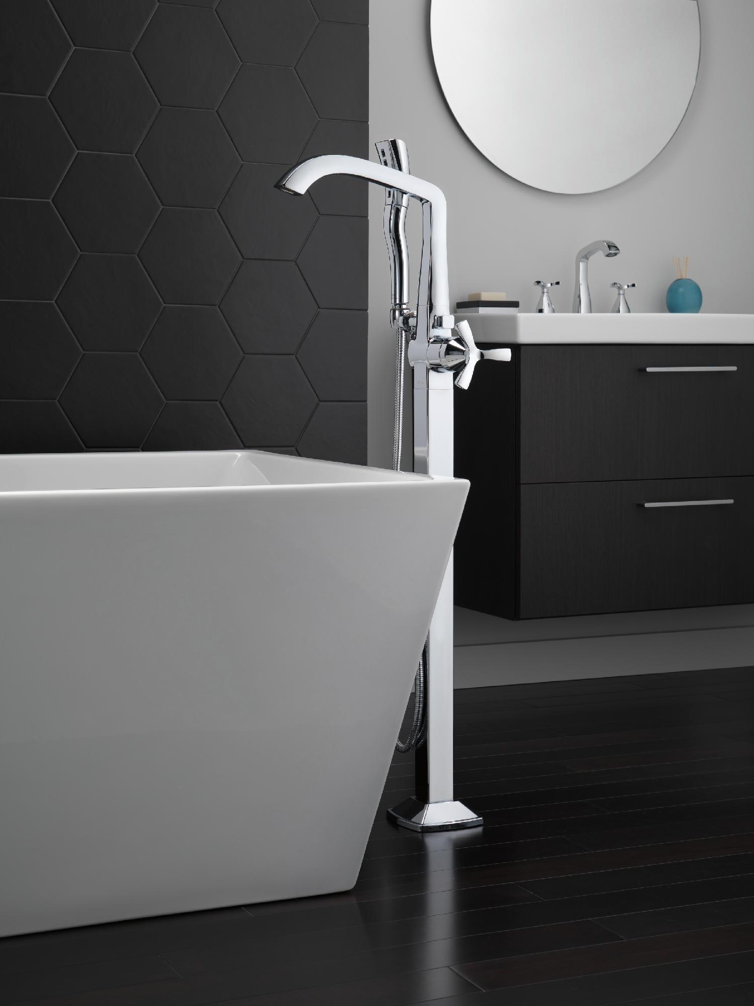 With subtly upturned spout and handles, the Stryke Bath Collection radiates confidence and composure with an assured stature and ascending contours. Designed to be integral to both your bathroom’s everyday use and personalized style, Stryke's robust design breathes intrigue into any space in your home. Complete your bath with a beautifully designed Delta roman tub faucet, meticulously crafted to turn heads and enhance your experience. The included hand shower makes this a versatile addition to your bath, perfect for rinsing off, washing loved ones and pets or keeping your tub clean. Delta H2Okinetic Hand Showers look different because they are different. Using advanced technology, H2Okinetic Hand Showers sculpt water into a unique wave pattern, giving you 3X the coverage of a standard shower head.* The end result is a hand shower that provides more coverage, more warmth and more intensity for a truly drenching experience. You can install with confidence, knowing that Delta faucets are backed by our Lifetime Limited Warranty. *Coverage measured in accordance with EPA WaterSense Specification for shower heads, March 4, 2010.