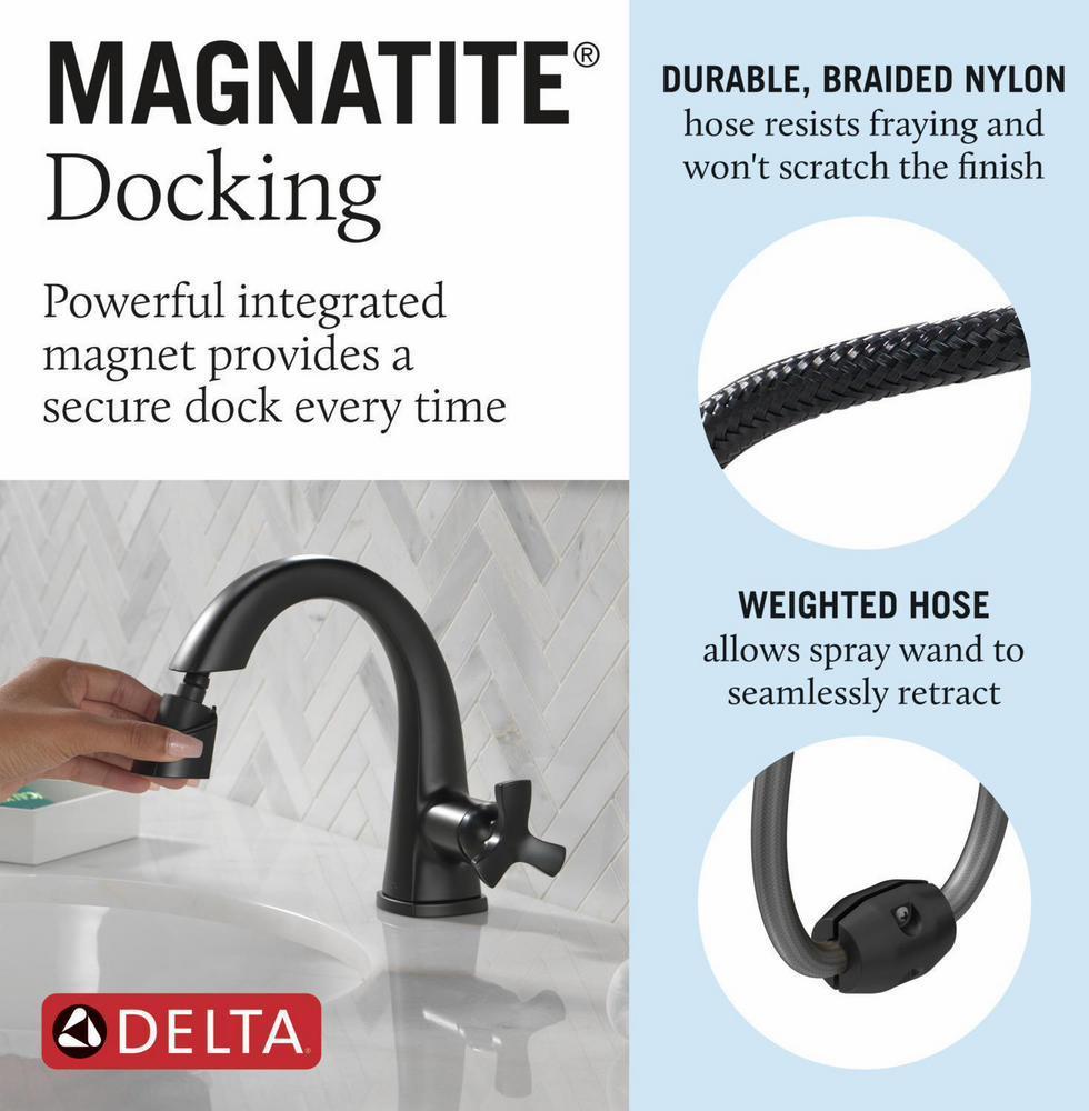 - MagnaTite® Docking uses a powerful integrated magnet to snap your faucet spray wand precisely into place keeping it docked when not in use