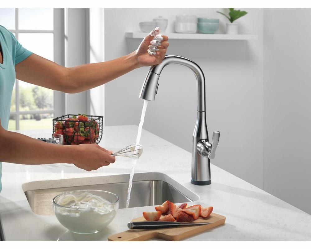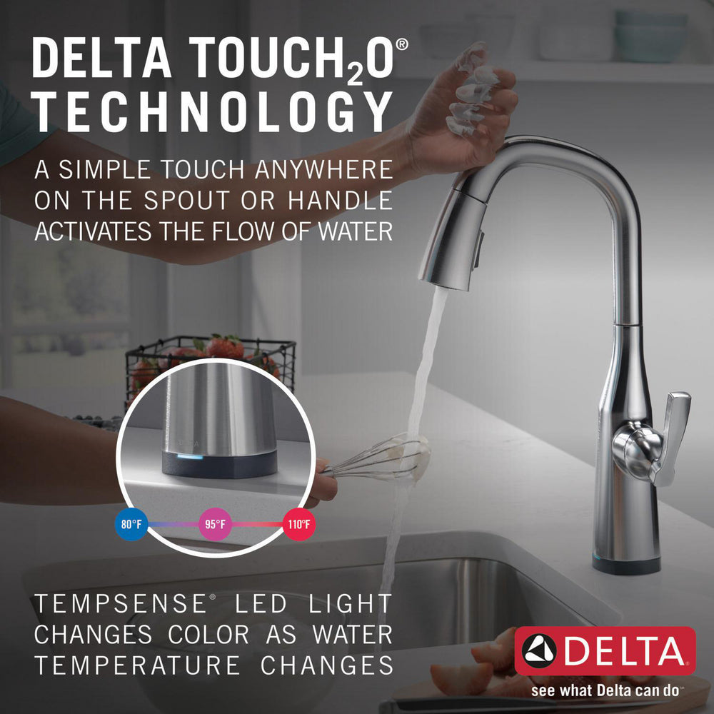 With subtly upturned spout and handles, Stryke Kitchen Collection faucets radiate confidence and include thoughtful innovations to enhance everyday use. Touch it on. Touch it off. Whether you have two full hands or 10 messy fingers, Delta Touch2O Technology helps keep your kitchen faucet clean, even when your hands aren’t. A simple touch anywhere on the spout or handle with your wrist or forearm activates the flow of water at the temperature where your handle is set. The Delta TempSense LED light changes color to alert you to the water’s temperature and eliminates any possible surprises or discomfort. You can install with confidence, knowing that Delta kitchen faucets are backed by our Lifetime Limited Warranty. Electronic parts are backed by our 5-year electronic parts warranty.